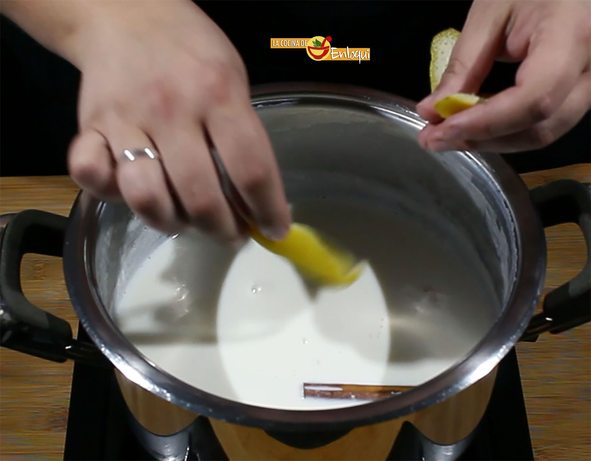 Lo primero que debes hacer es poner la leche al fuego en una olla o cazo hasta que alcance el punto de ebullición. En ese momento baja el fuego y añade el arroz junto con la canela en rama y los trozos de piel de limón.