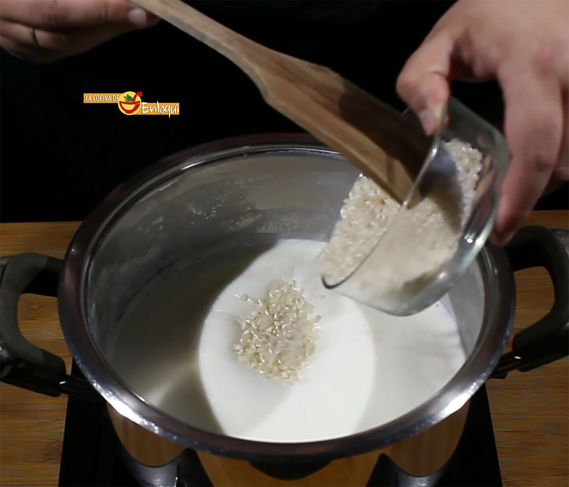 Deja cocer a fuego bajo y removiendo para que el arroz comience a soltar todo el almidón. Esta será la clave para que nos quede bien cremoso sin caer en el error de incrementar la carga calórica usando nata o leche condensada.