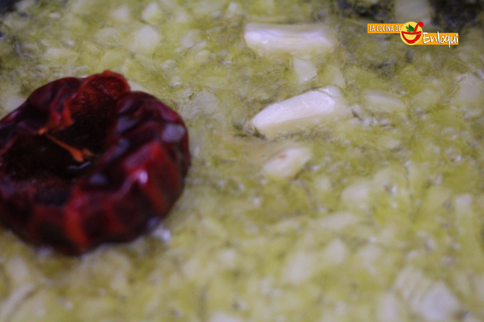 Vamos a preparar la salsa. Sofreímos en un fondo de aceite la cebolla picada, unos dientes de ajo pelados y añadimos la nora, que le hemos retirado el rabo y las pepitas y la hemos tenido en remojo unos minutos para que se hidrate.