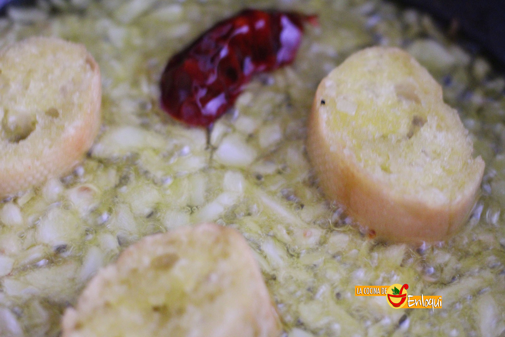 En ese mismo aceite y con los ingredientes anteriores, ponemos también a freír unas rebanadas de pan del día anterior. Cuando todo esté doradito añadimos el vino blanco y lo dejamos cocer un par de minutos.