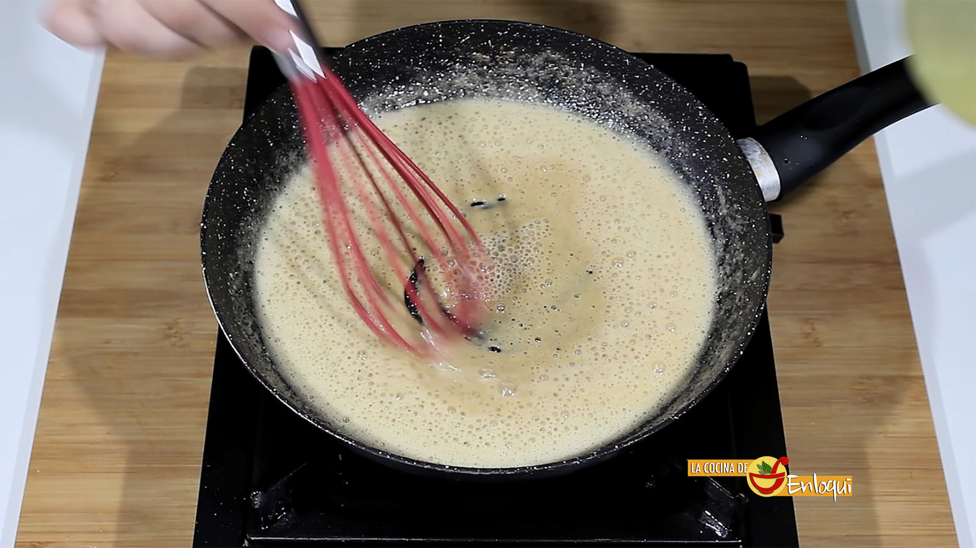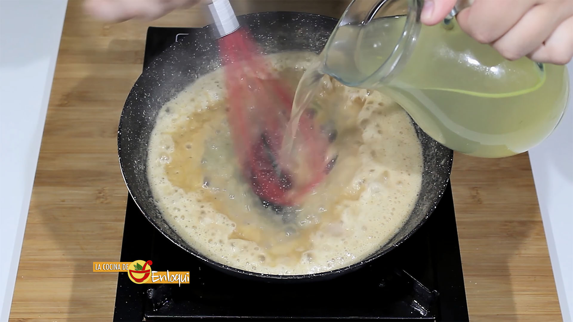 Cuando la harina haya cambiado un poco de color ya estará tostada y es el momento de añadir el caldo bien caliente. No dejes de remover con las varillas manuales, de esta forma no se formarán grumos.