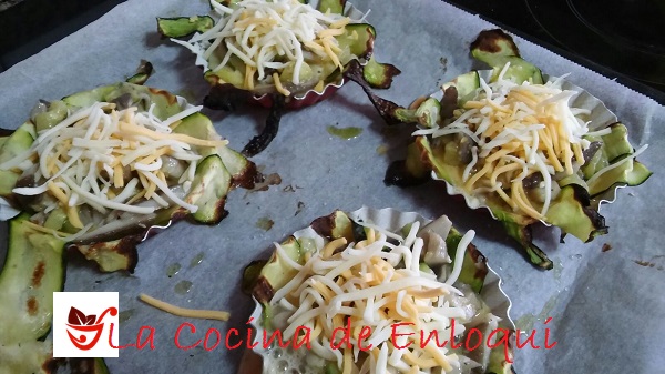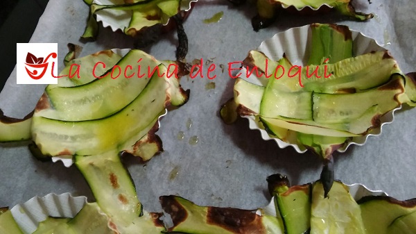 Te recomiendo comenzar preparando las tartaletas de verdura. Para ello corta el calabacín a lo largo, con la ayuda de un pelador, para que queden lonchas finas.  Con estas lonchas de calabacín cubre los moldes de tartaletas para hacer la base de las mismas. Pon por encima unas gotitas de aceite de oliva y hornea a 150º durante 5 minutos.
