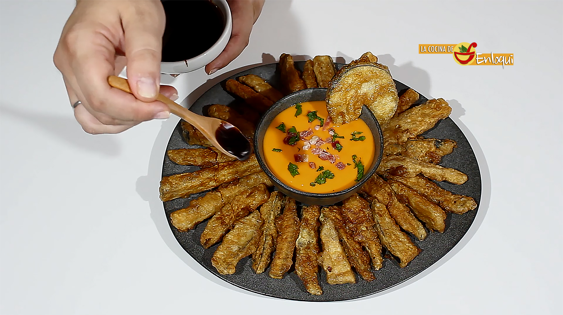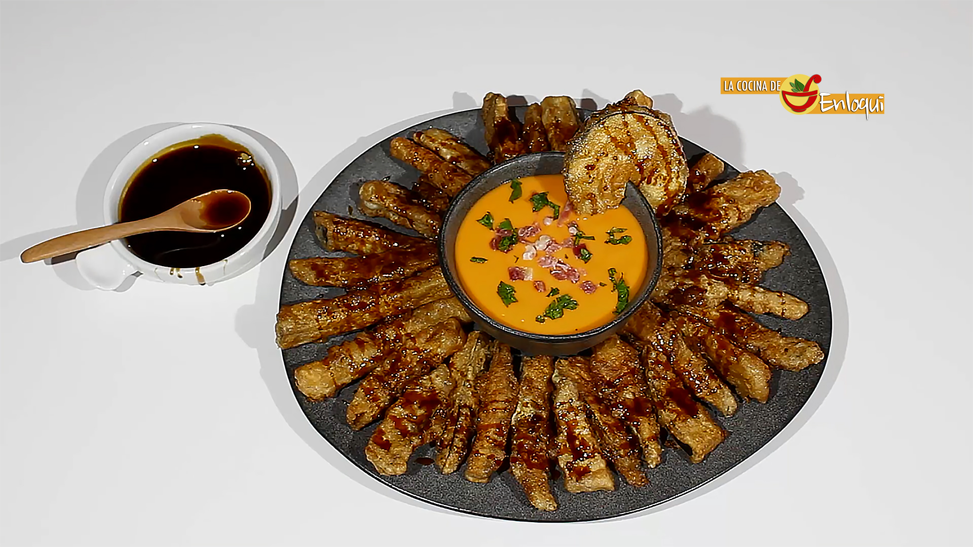 Llegado el momento de servir para llevar a la mesa coloca los trozos de berenjena frita en una bandeja. Yo lo he colocado alrededor de un cuenco donde he puesto salmorejo y he acompañado con unos tacos de jamón serrano y un poco de perejil fresco picado.