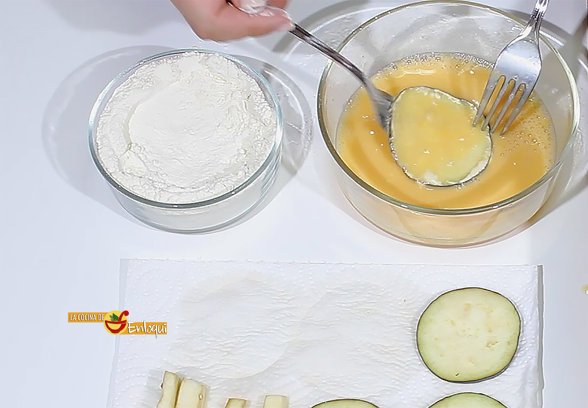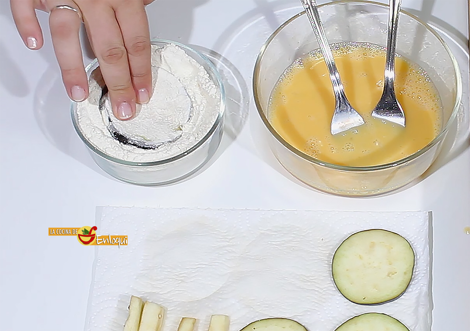 Una vez que hayas secado todas las berenjenas es el momento de prepararlas para que te queden bien crujientes y no absorban demasiado aceite al freír después. Para ello te muestro el siguiente tip.
