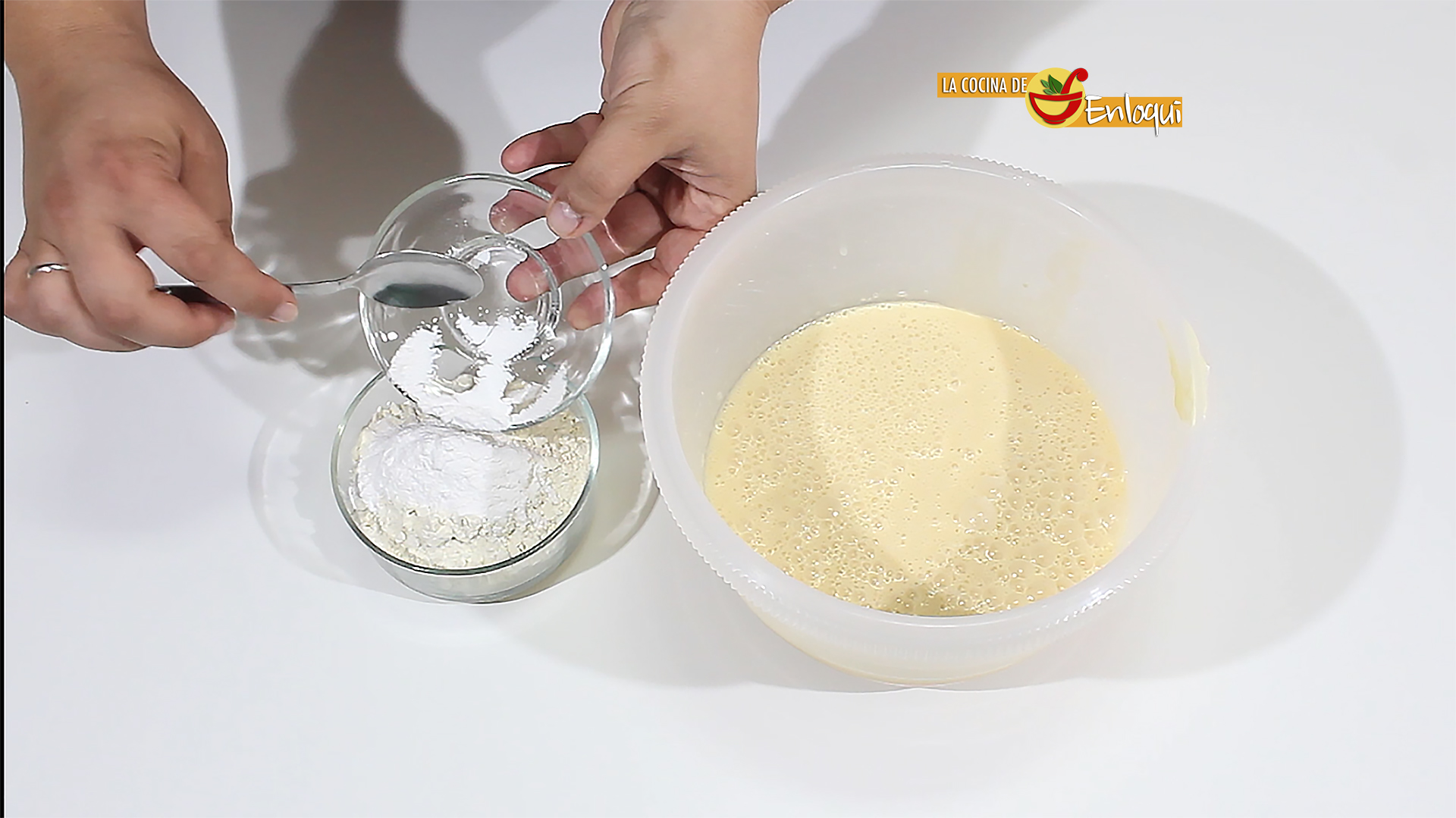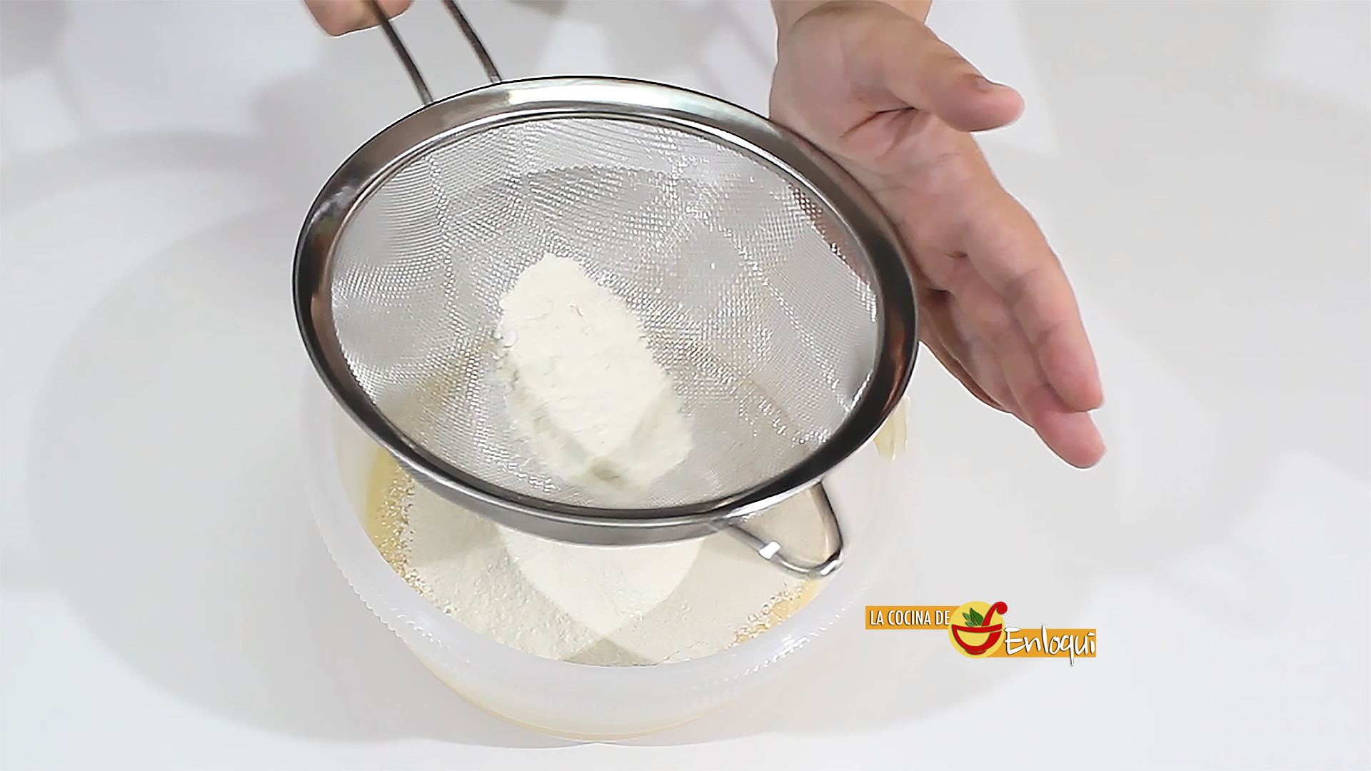 Por otro lado mezcla la harina con la levadura química o polvos para hornear y añade a la mezcla anterior con la ayuda de un tamiz. Puedes tamizar con un colador simplemente. Así de fácil.