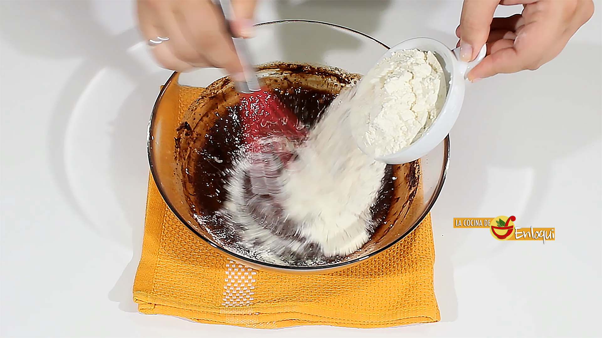 A continuación añade la mezcla de chocolate y mantequilla fundida que habías reservado antes y sigue mezclando con las varillas manuales.