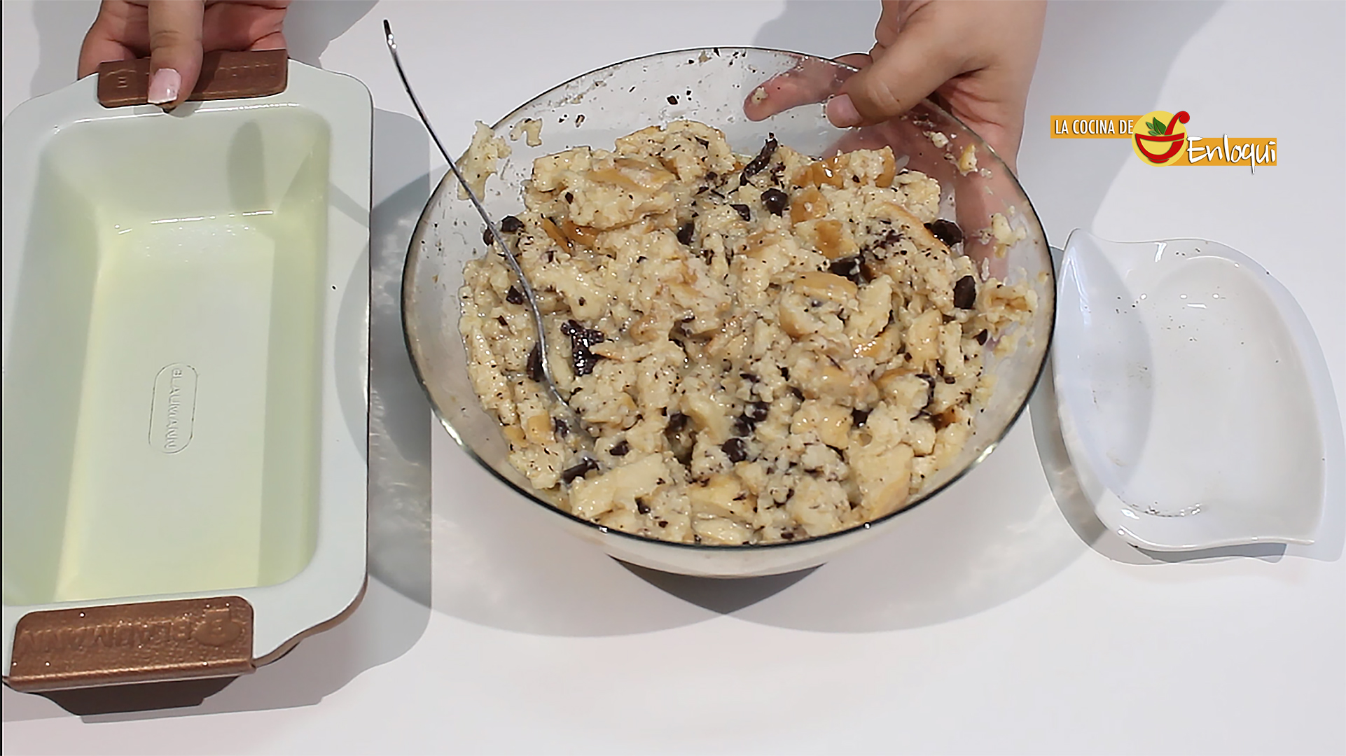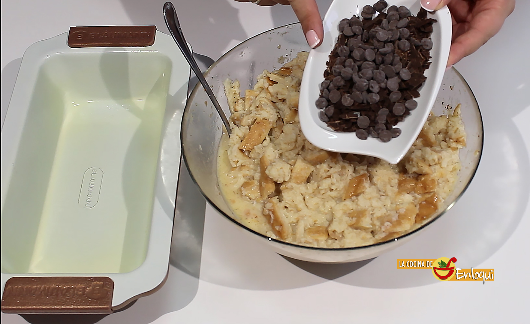 Una vez que el pan haya quedado bien empapado añade las chispas de chocolate y remueve.