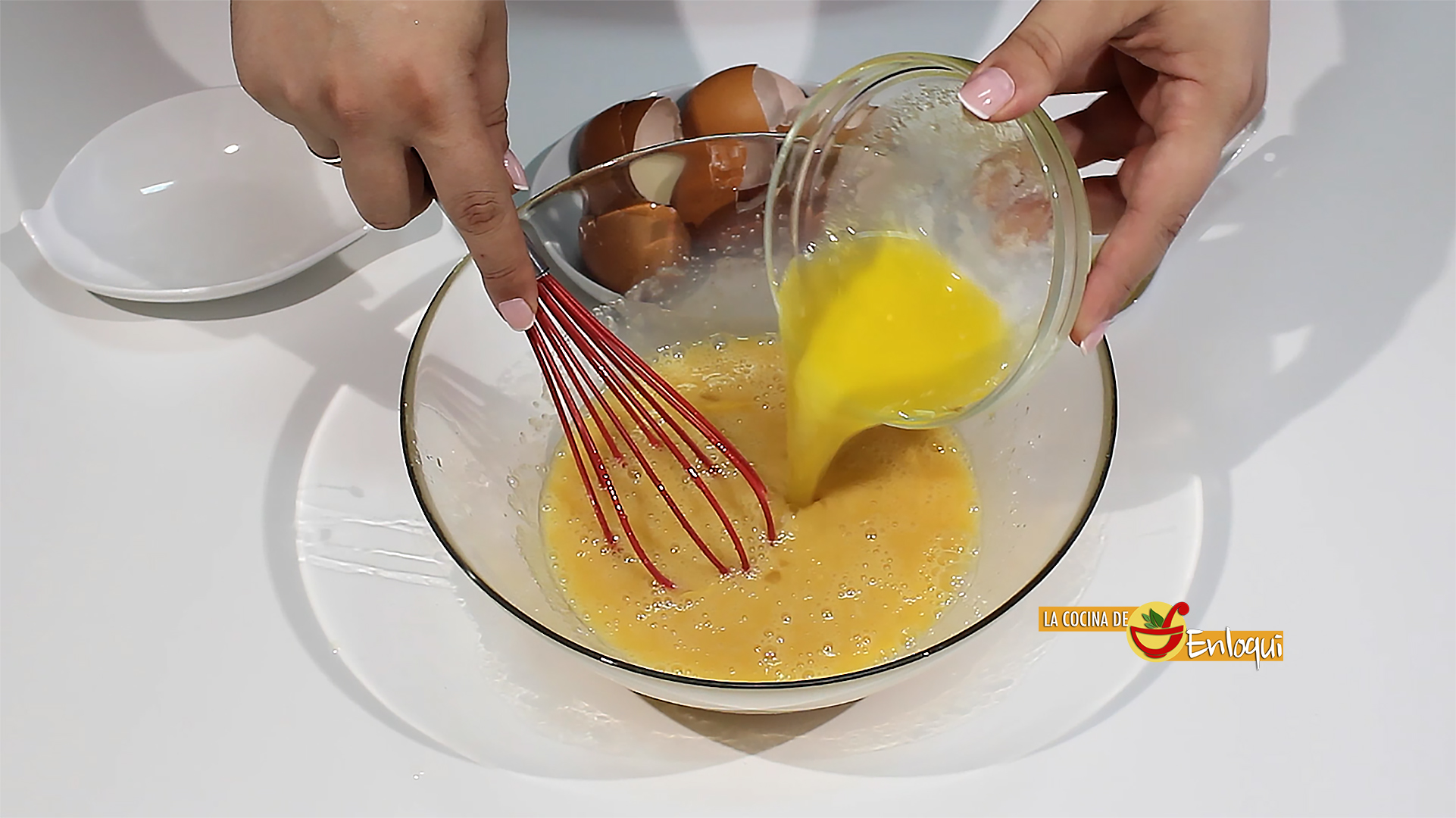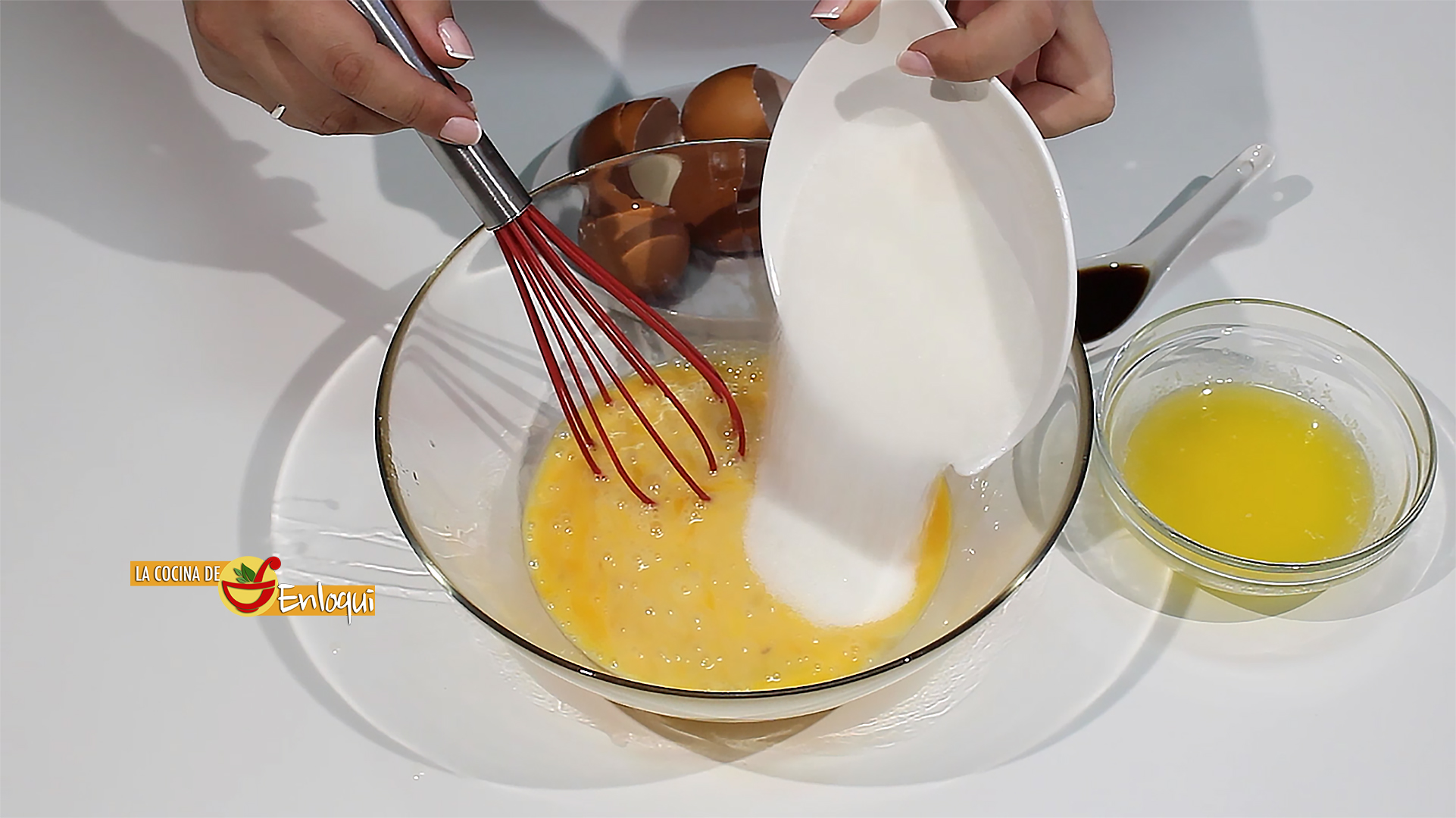 Esta receta es tan sencilla que, aunque no seas muy habilidoso con los postres, conseguirás un resultado espectacular. Comienza poniendo en un bol amplio los huevos junto con el azúcar y bate con las varillas manuales.