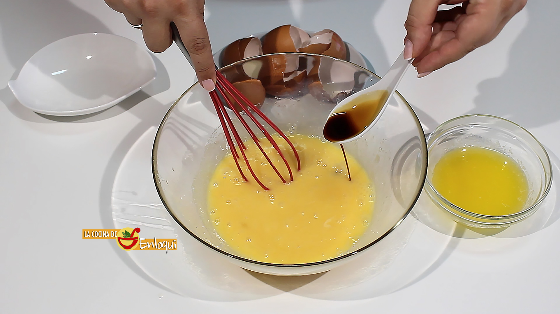 A continuación añade la esencia de vainilla y la mantequilla fundida. Continúa batiendo, integrando los ingredientes.