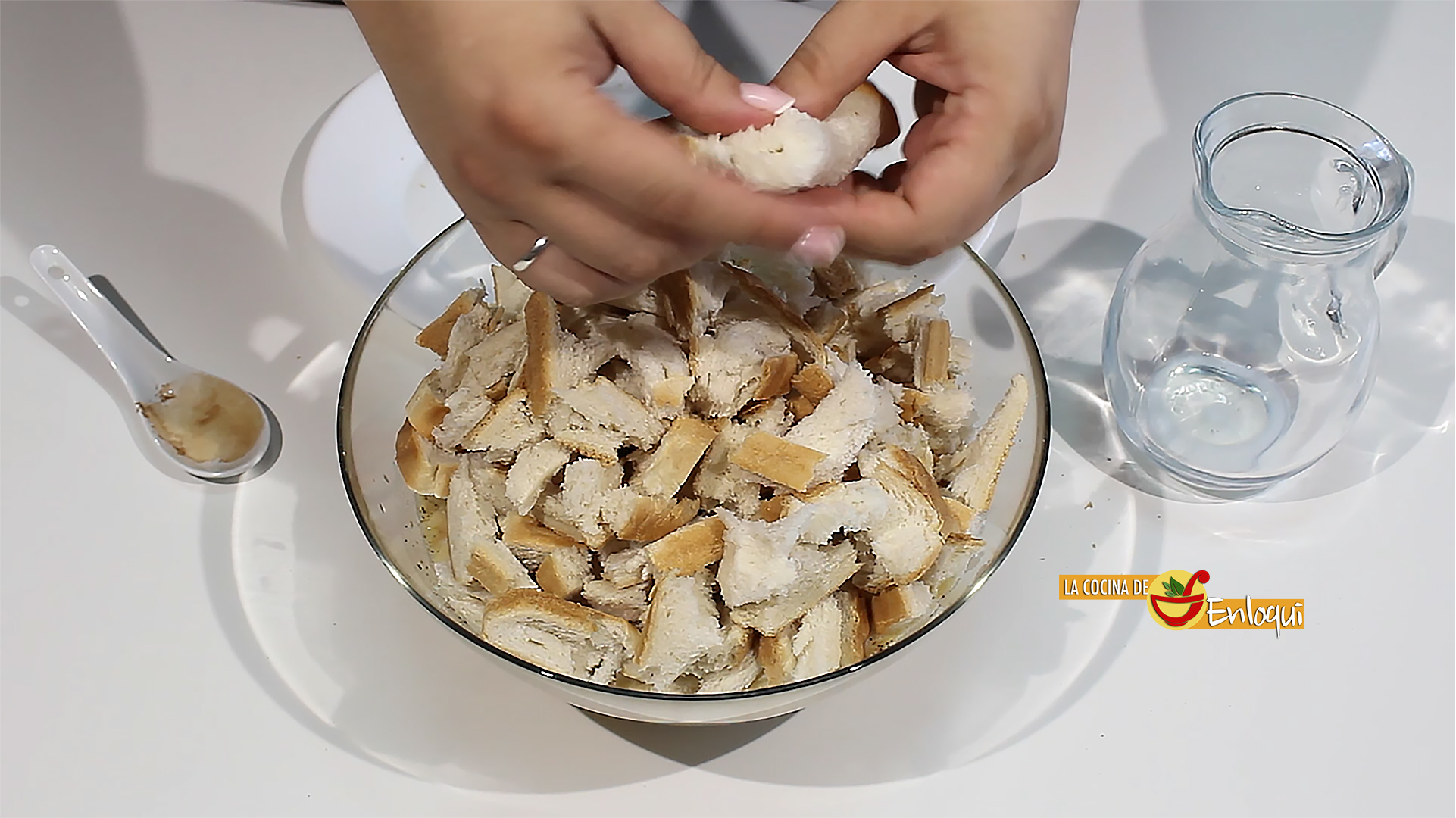 Es el momento de añadir el pan de molde cortado en pequeños trozos. Mezcla para que se empapen bien en la mezcla anterior.