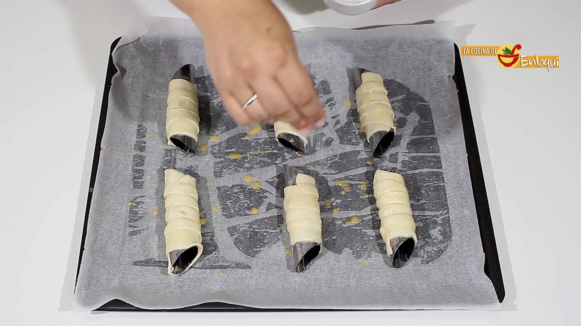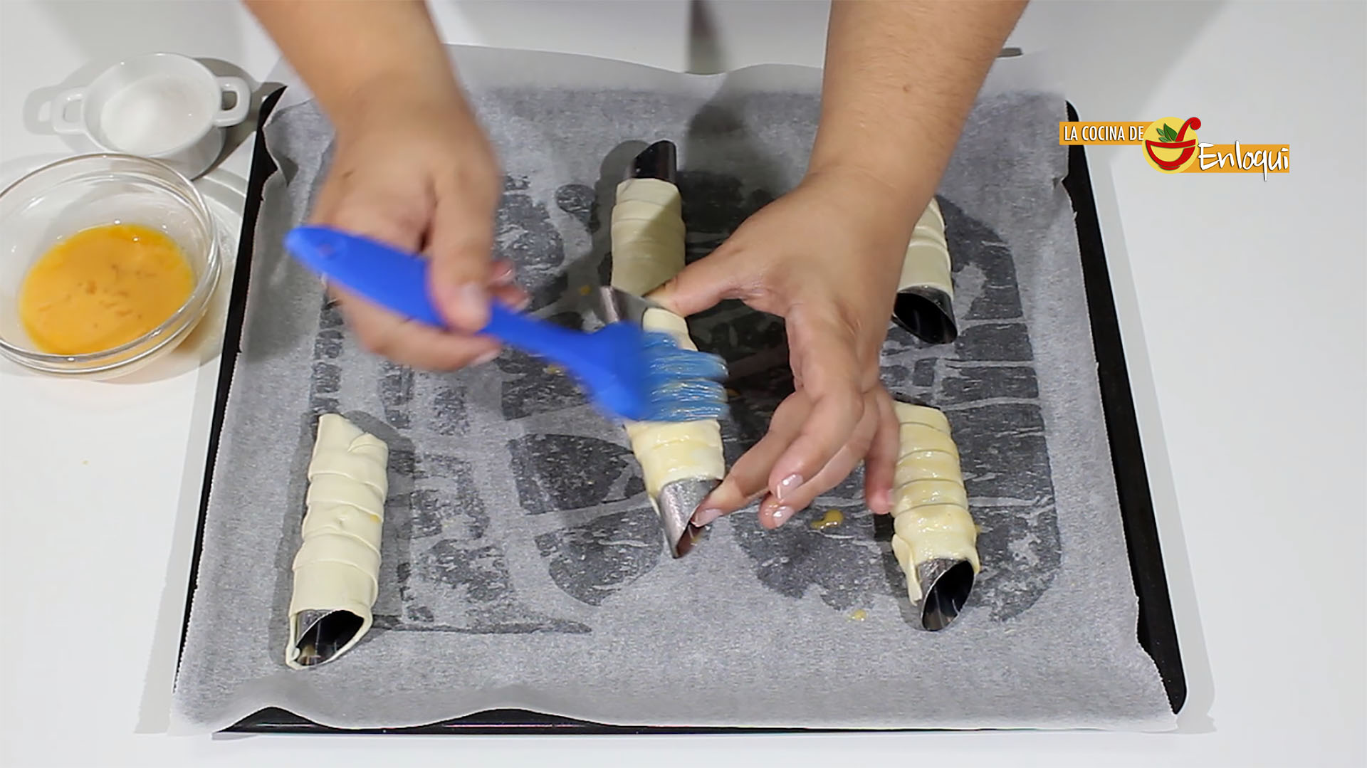 Cuando los moldes estén pintados enrolla sobre ellos las tiras de hojaldre, superponiendo un poco una capa sobre otra para que no queden huecos. Colócalos sobre una bandeja de horno forrada con papel vegetal.