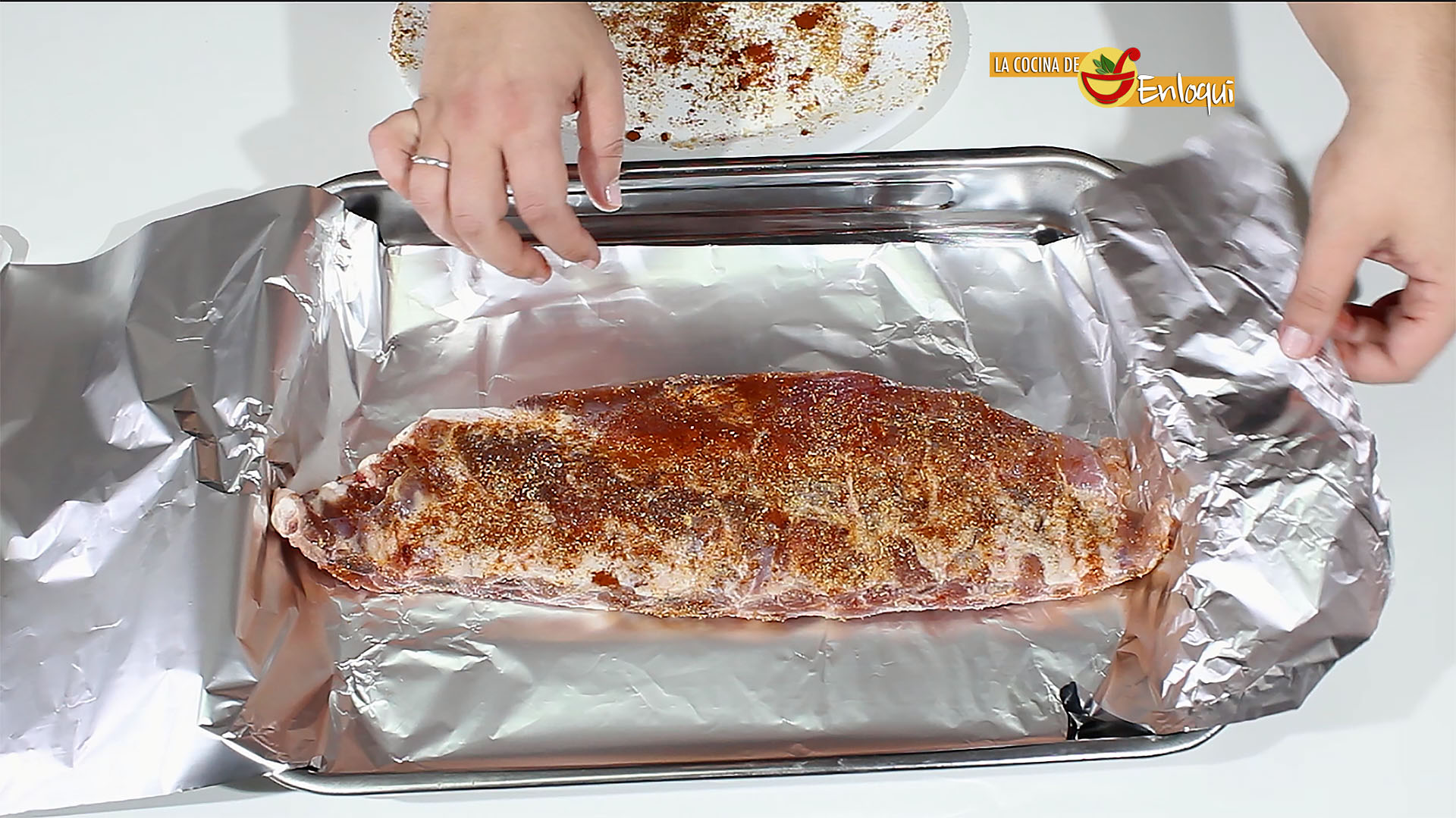 Mientras que el horno adquiere la temperatura sazona el costillar con ajo en polvo, cebolla en polvo, pimentón, sal y pimienta negra molida. Ponle por toda la superficie, da la vuelta a la pieza y repite el proceso, de forma que quede sazonado por completo.