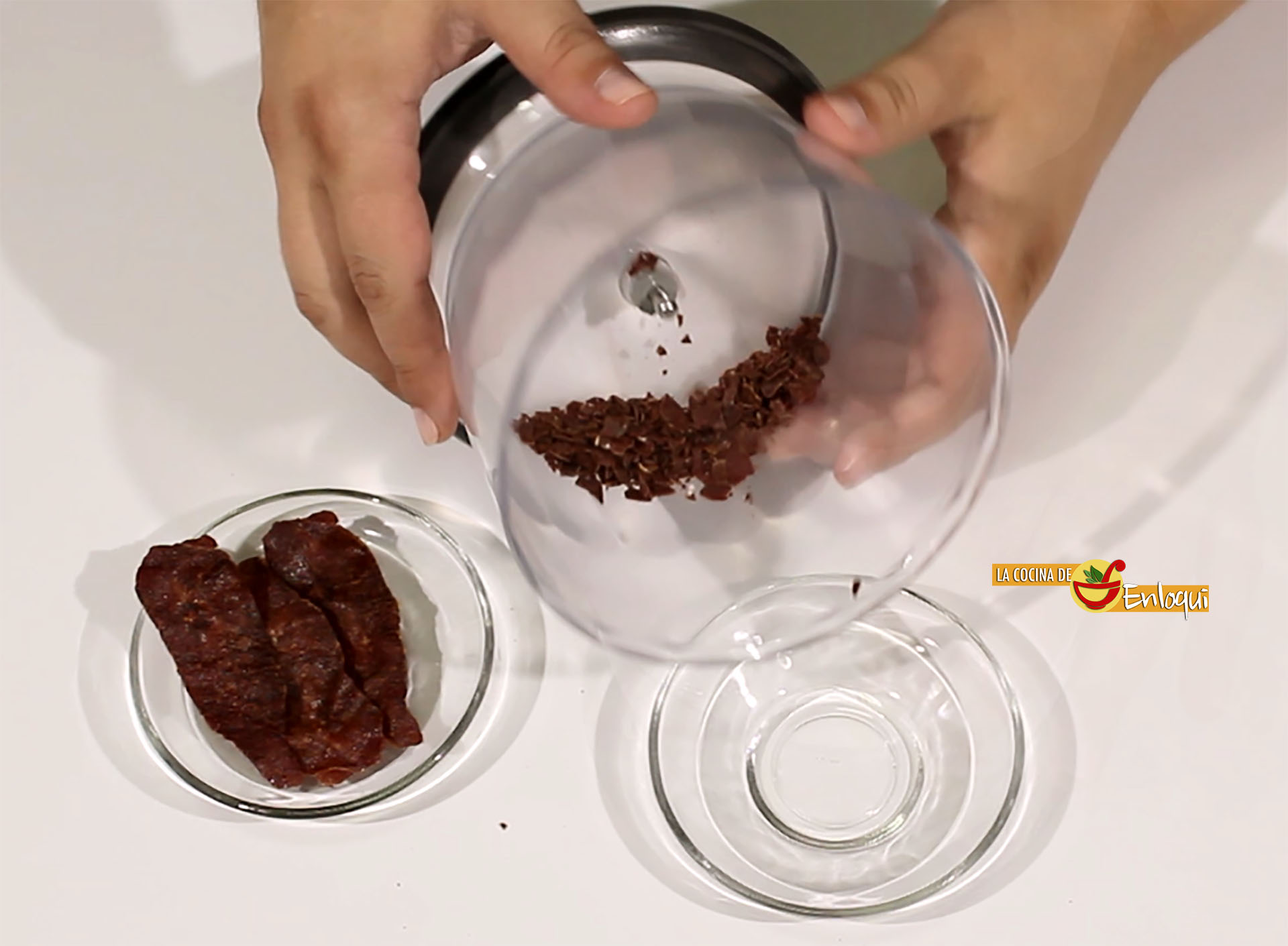 Ahora pon en el accesorio picador de la batidora las lonchas deshidratadas de cecina y tritura un poco hasta conseguir esa sal o escamas que querías conseguir.