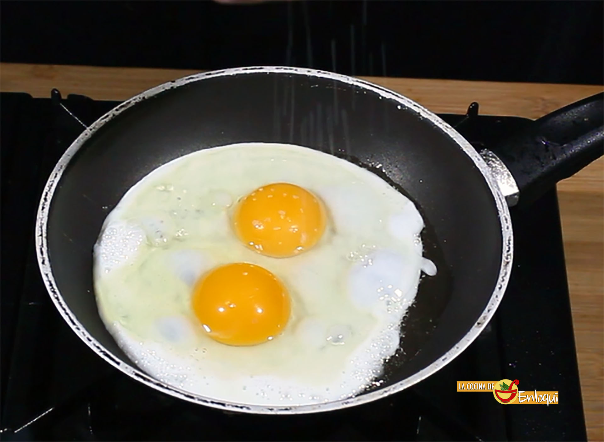 Ahora prepara los huevos a la plancha, en una sartén antiadherente y ponles un poco de sal y pimienta.