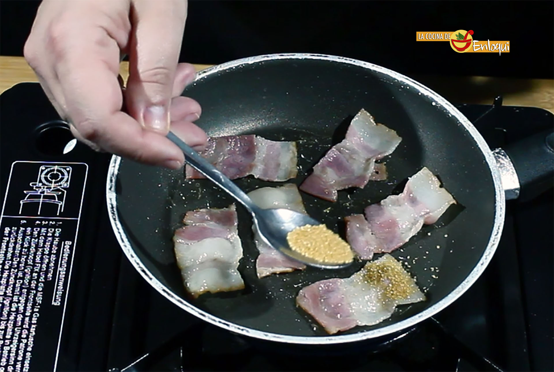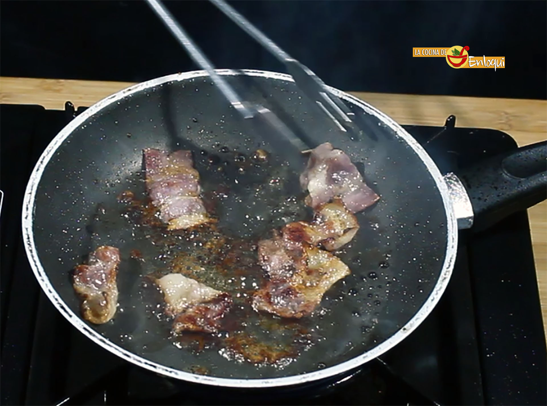 Comienza colocando en una sartén antiadherente las lonchas de bacon cortadas en 3 trozos. No es necesario que añadas aceite, ya que se cocinará con la propia grasa del bacon.