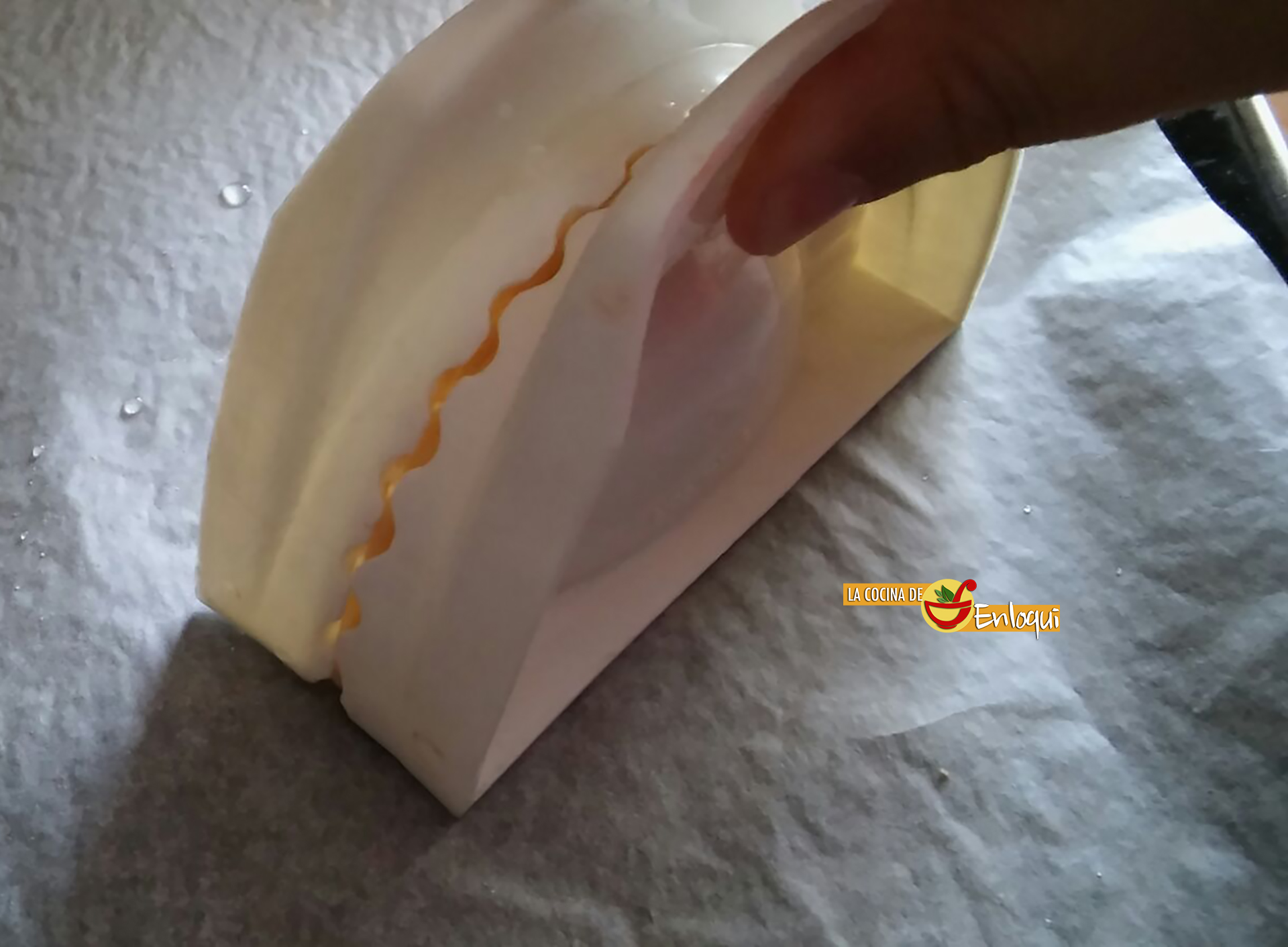 Cuando esté cocinado añadimos el atún escurrido y desmigado, y el huevo cocido picado muy fino, mezclamos bien todo, probamos de sal y empezamos a rellenar las empanadillas. Ponemos una cucharada de la mezcla anterior en el centro de la oblea y cerramos usando un artilugio como este de la foto, o bien, doblando por la mitad y sellando los bordes con un tenedor.