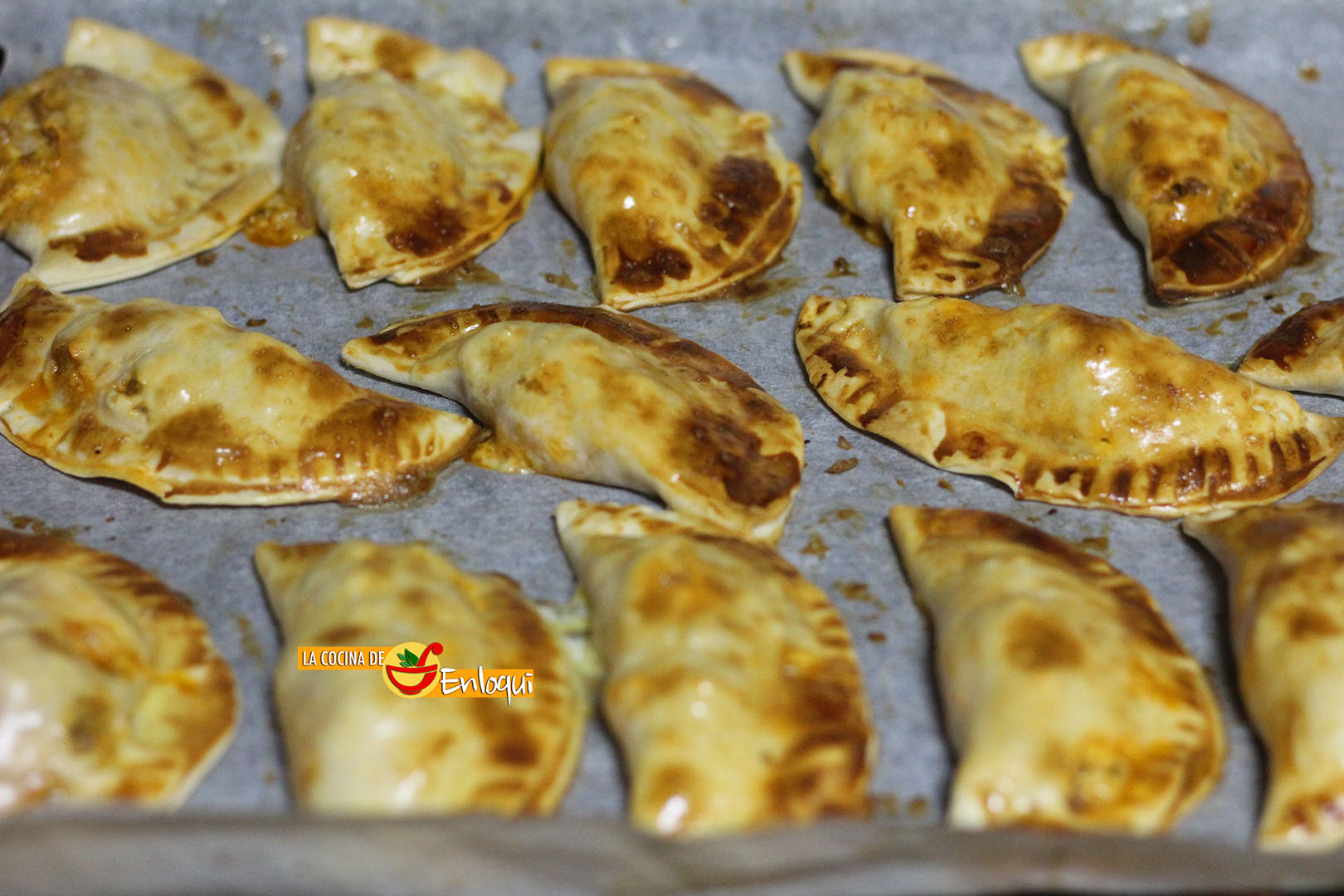 Introducimos la bandeja con las empanadillas al horno, que tenemos precalentado a 180ºC con calor arriba y abajo. Las dejamos unos 20 minutos, o bien, hasta que las empanadillas queden bien doradas.