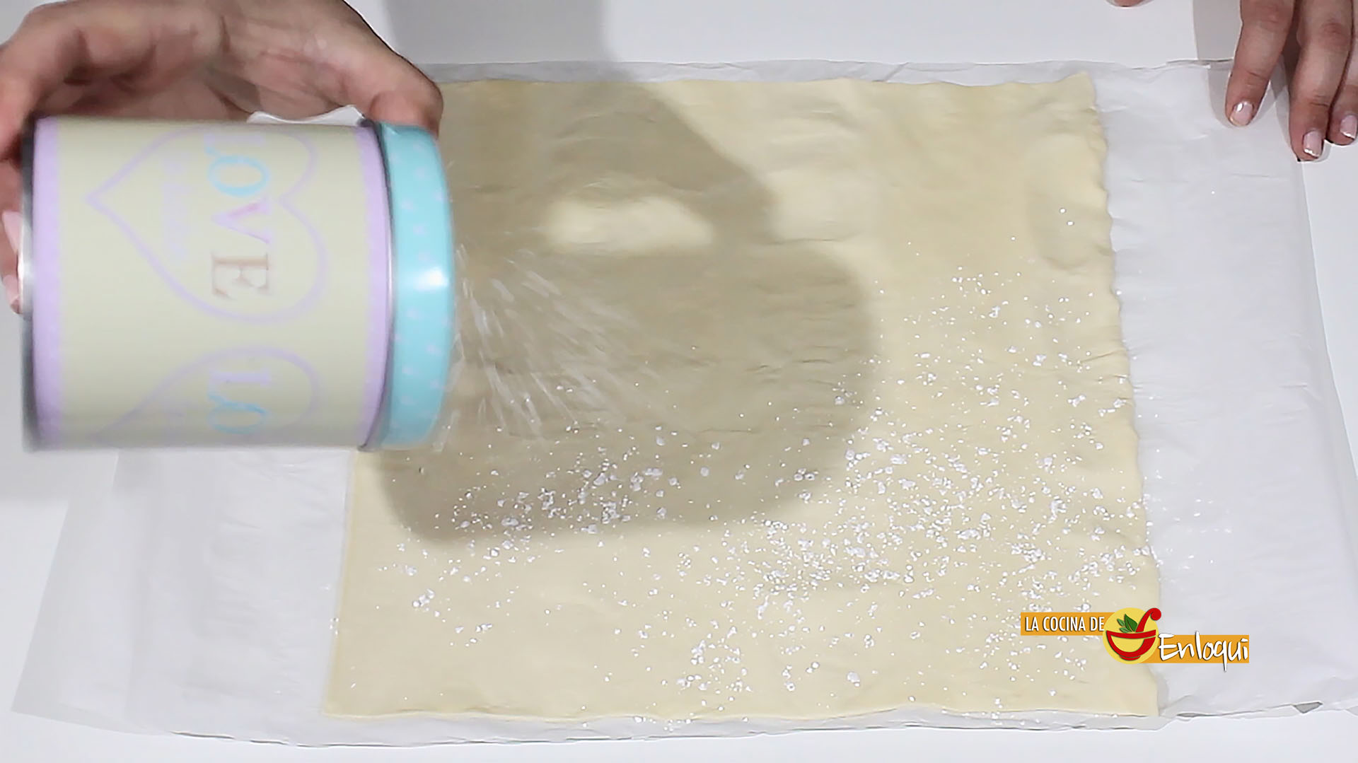 Para comenzar a preparar estas ensaimadas de chocolate debes colocar la masa de hojaldre refrigerado sobre la superficie de trabajo. Espolvorea con un poco de azúcar glass y, con la ayuda de un rodillo, termina de estirar la masa y ayuda a que el azúcar quede adherida a la masa. De esta forma daremos un toque dulce a esta masa neutra que podemos usar en mil elaboraciones. Ahora corta en tiras de dos dedos de ancho aproximadamente.