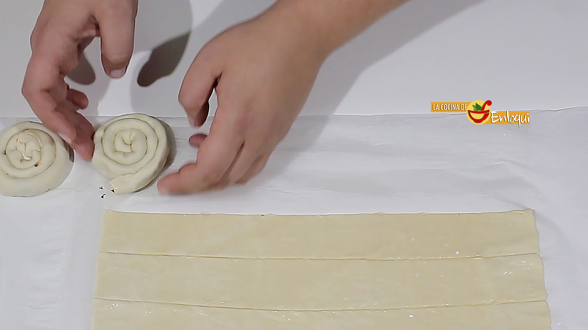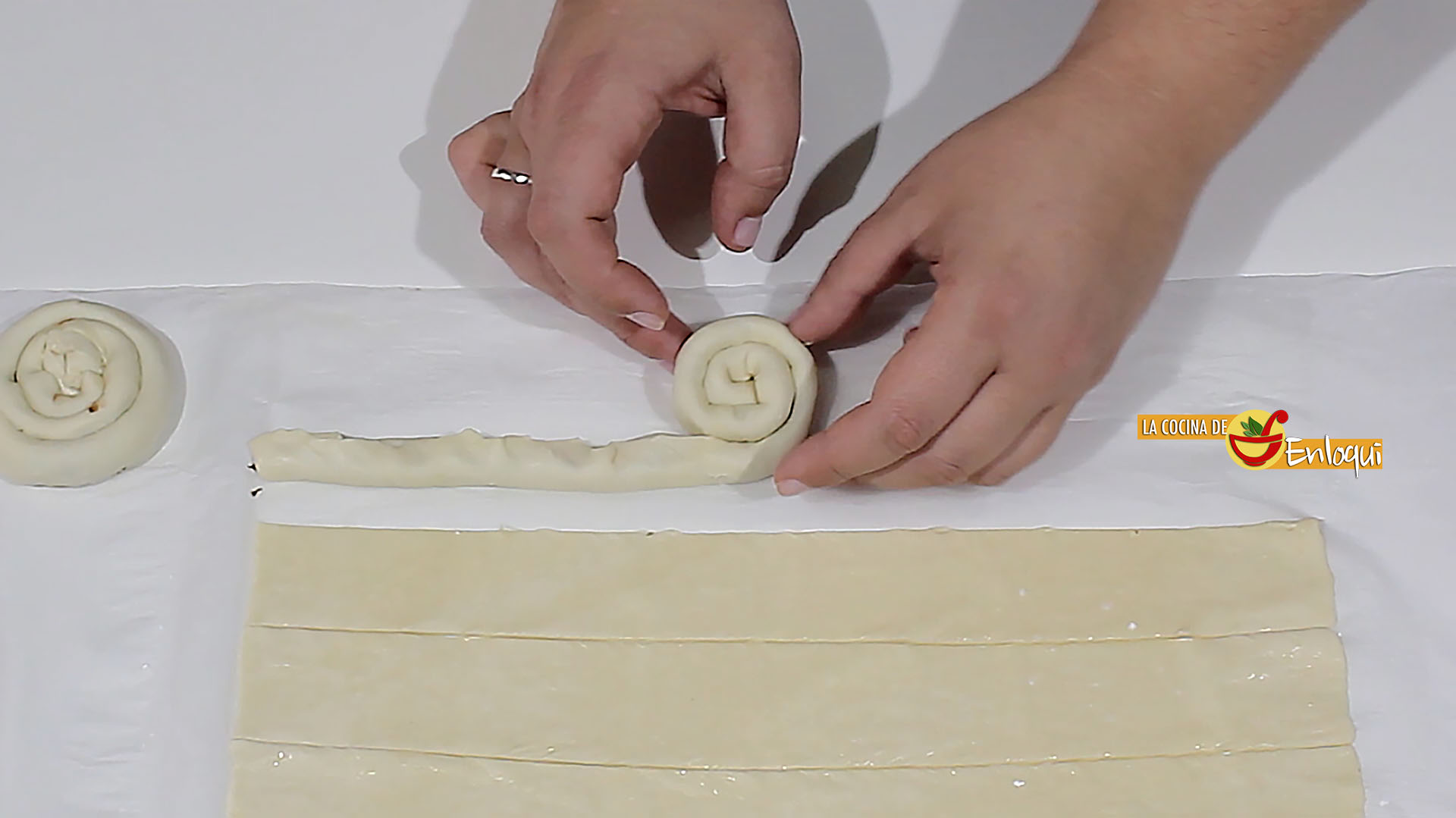 Con cada uno de los rulos rellenos de chocolate que has obtenido, haz una espiral, enrollando sobre sí mismo, de forma que queden pequeñas ensaimadas o caracolas.