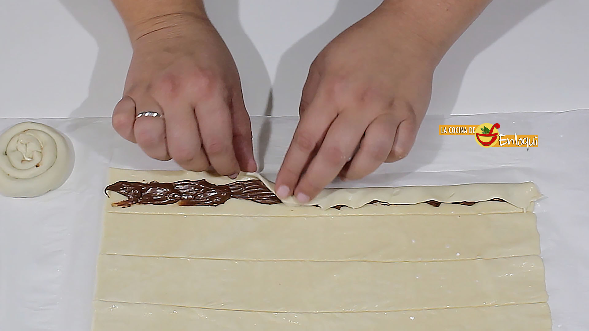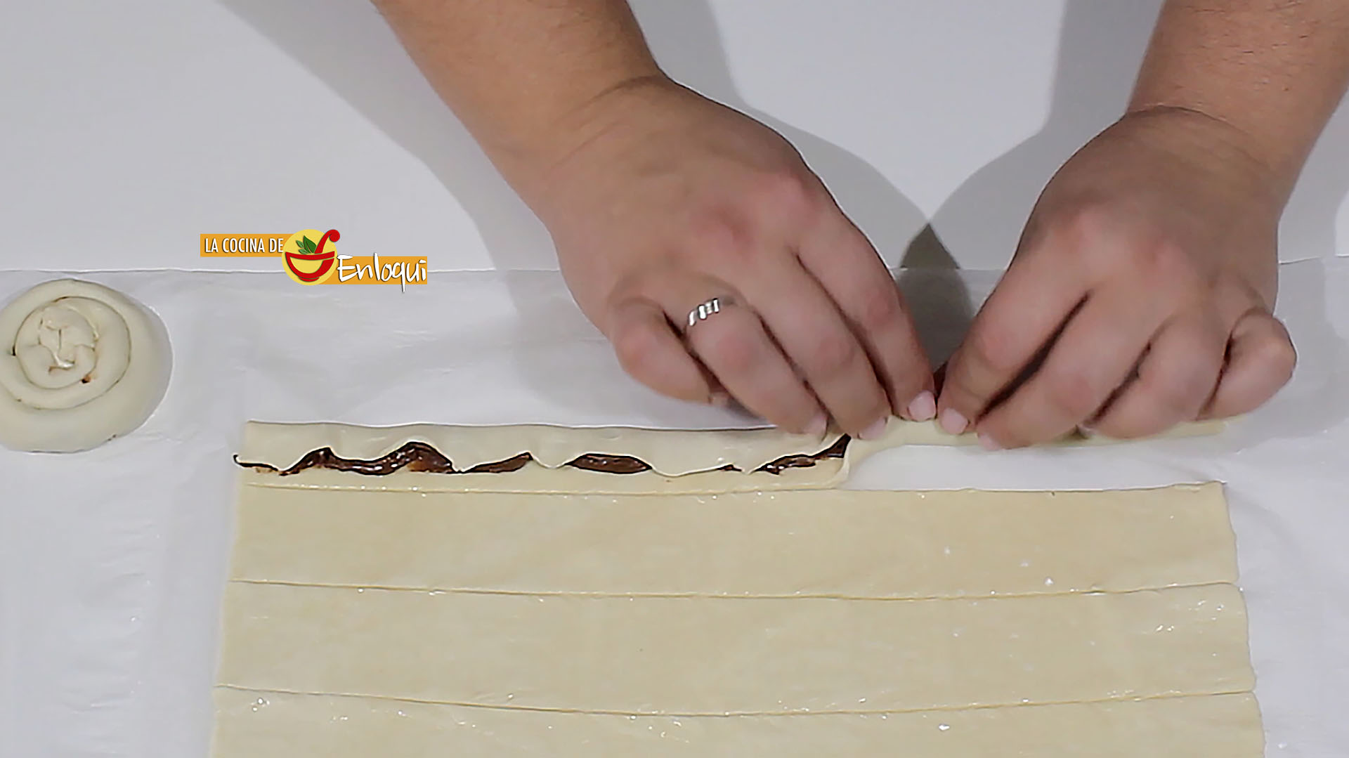 Pon en el centro de cada tira la crema de cacao con avellanas, a todo lo largo y dobla primero de un lado al centro y después del otro lado al centro. De esta forma quedará un rulo con el cacao en el interior. Repite el proceso con el resto de tiras de hojaldre.