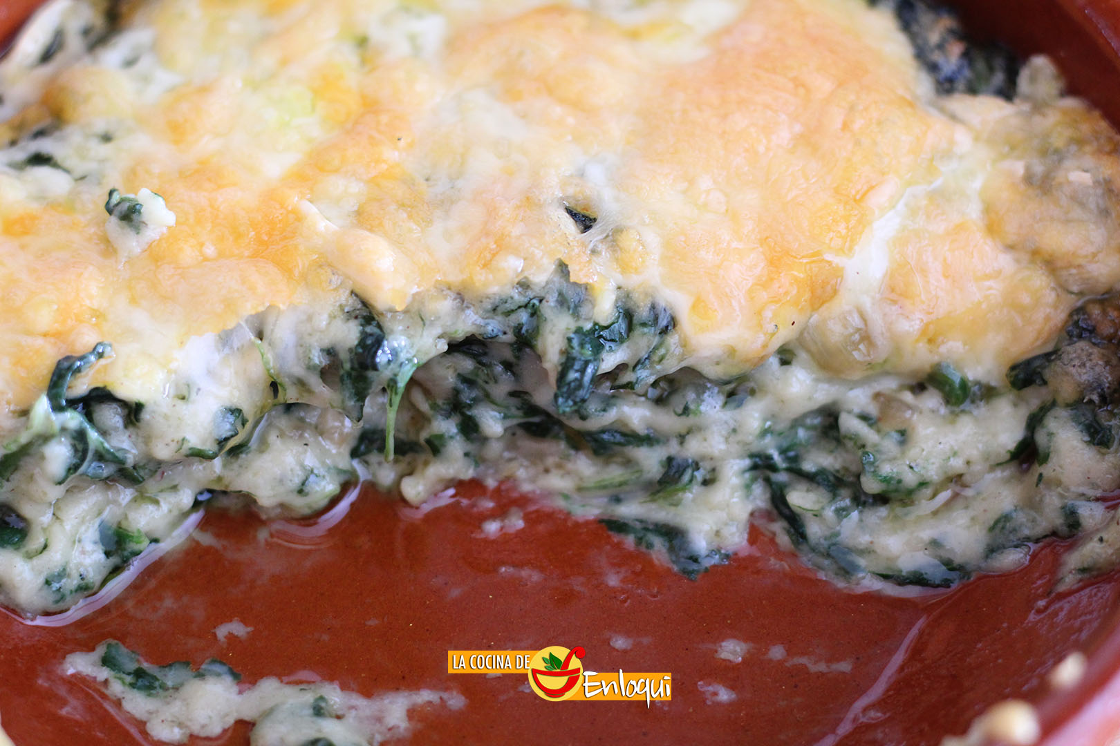 Con esta receta conseguimos un plato cremoso, con un sabor suave. Podemos usar espinacas frescas o congeladas, lo que tengamos a mano. Debemos tener en cuenta el refrán: “Espinacas, muchas metes pocas sacas”, pues con las frescas vemos cómo una sartén repleta con una gran montaña de espinacas, se queda en nada.