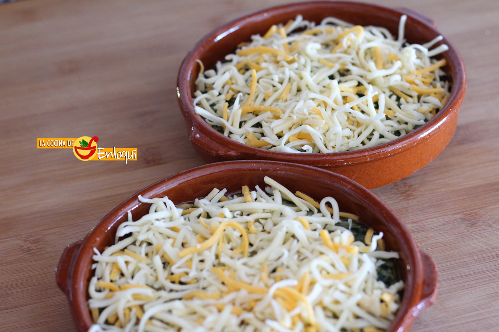 Cuando las espinacas estén listas y la bechamel preparada las mezclamos, removiendo. Colocamos la mezcla en una cazuela apta para el horno, podemos presentar en cazuelas individuales. Cubrimos todo con una capa de queso rallado y llevamos al horno que hemos tenido precalentando a 200ºC para gratinar.
