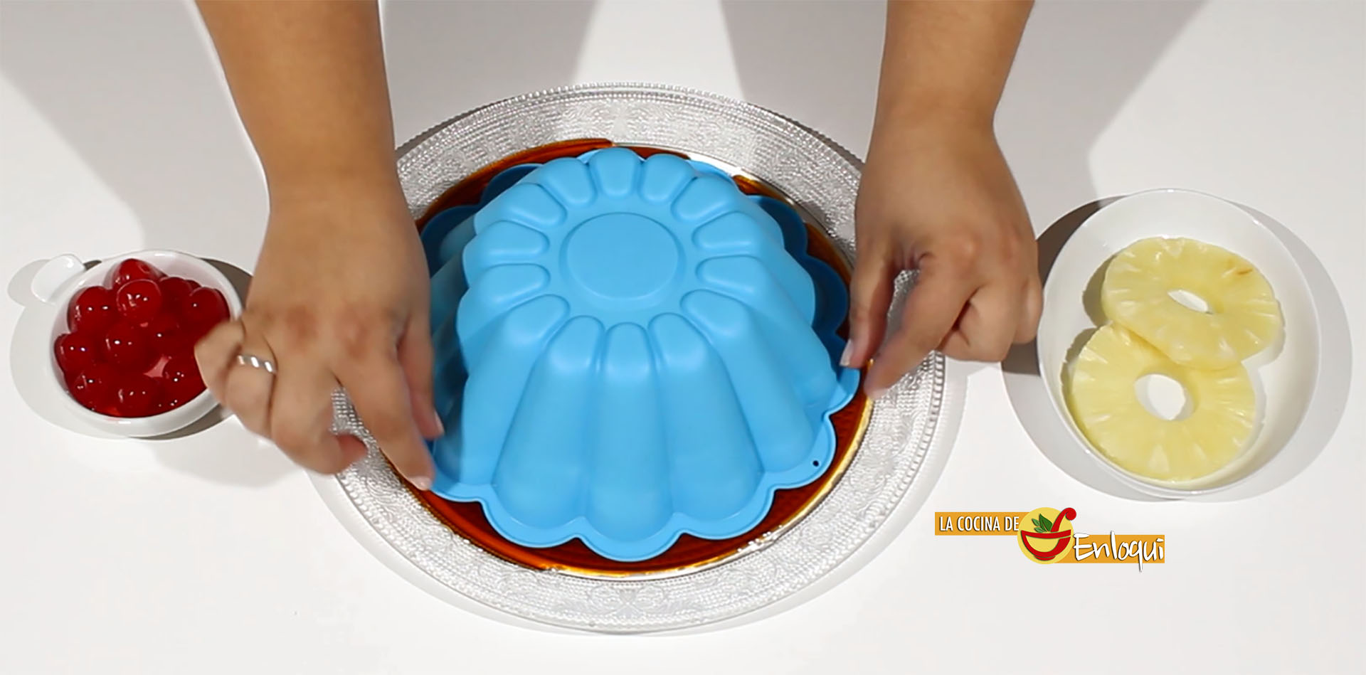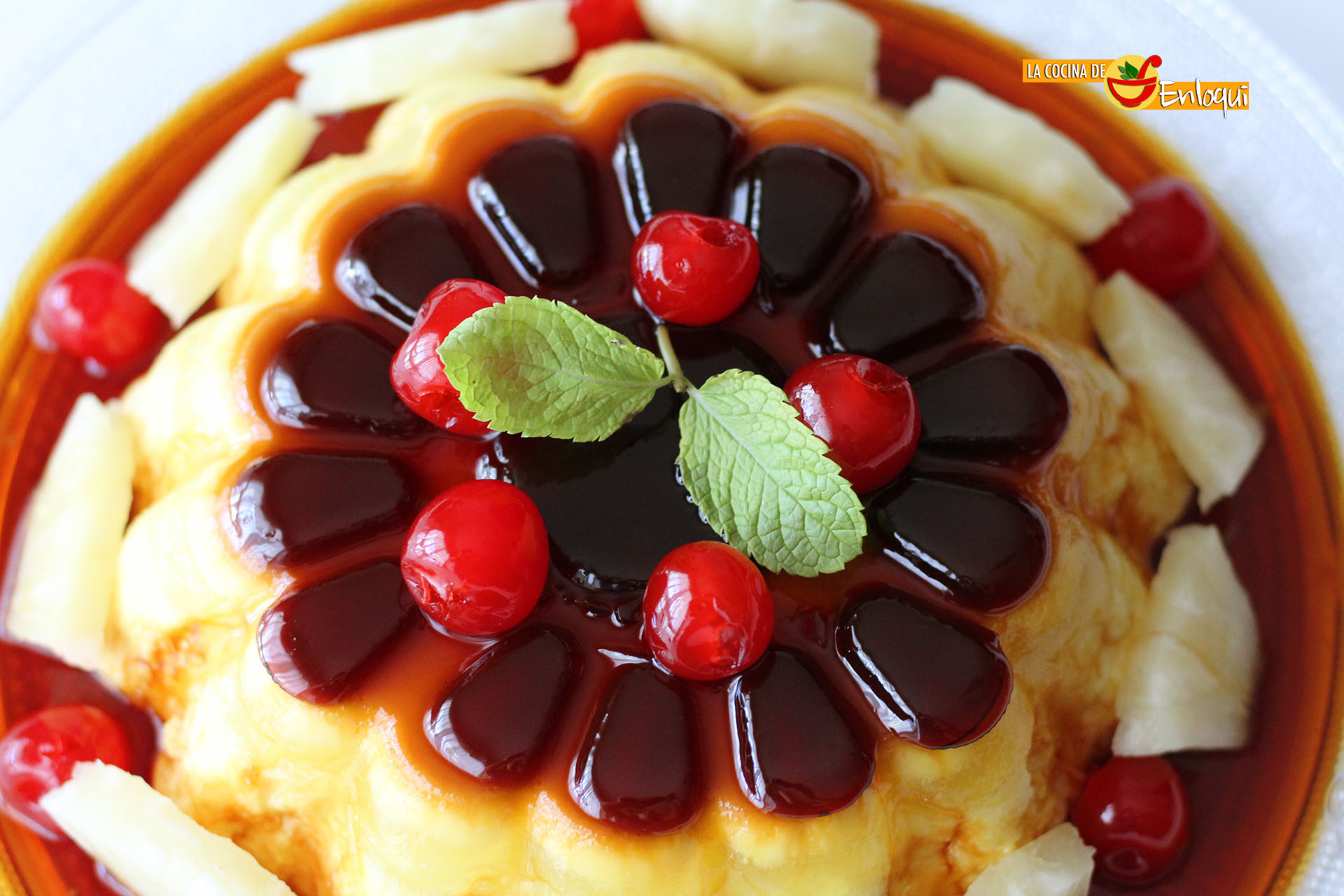 Pasado ese tiempo es el momento de servir. Desmolda sobre una bandeja o plato llano y decora con las guidas y los trozos de piña.