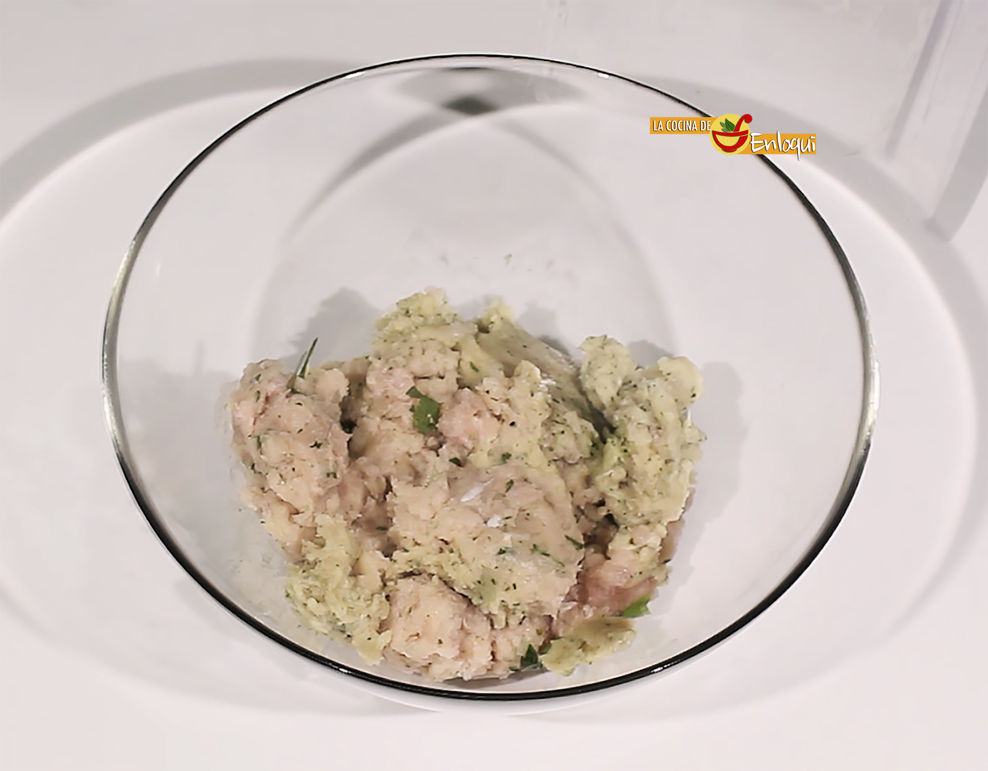 Ahora pon en el accesorio picador de la batidora la carne de pollo y el perejil fresco. Tritura hasta que la carne quede picada por completo.
