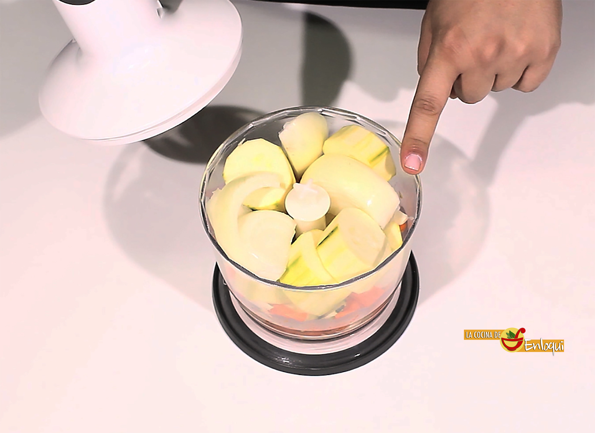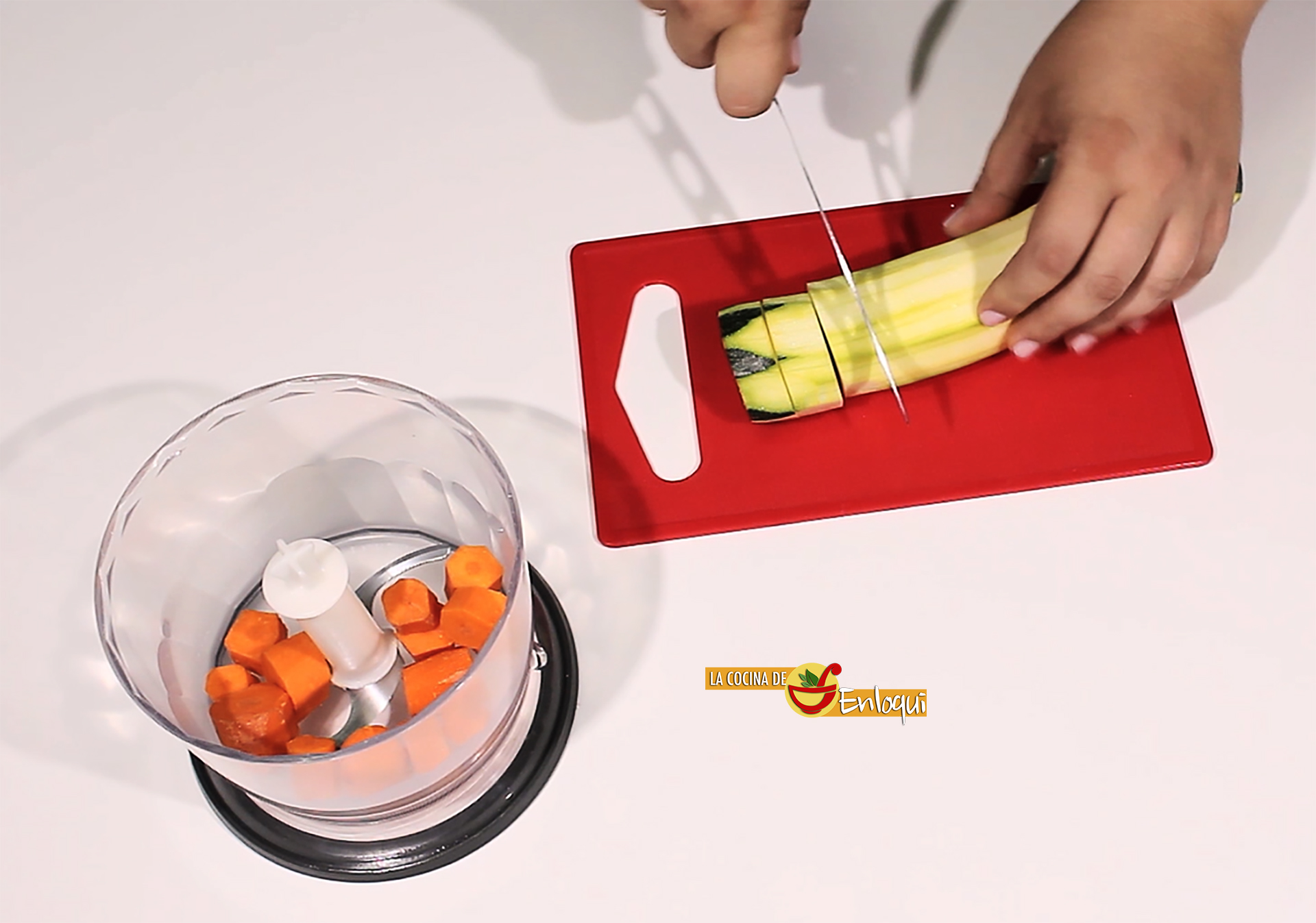 Para preparar estas deliciosas hamburguesas lo primero que debes hacer es pelar la verdura. Elimina la piel del calabacín, las zanahorias y la cebolla. Ponlas en el accesorio picador de la batidora y tritura un par de minutos hasta que consigas un puré de verdura. De esta forma los vegetales pasarán totalmente desapercibidos.