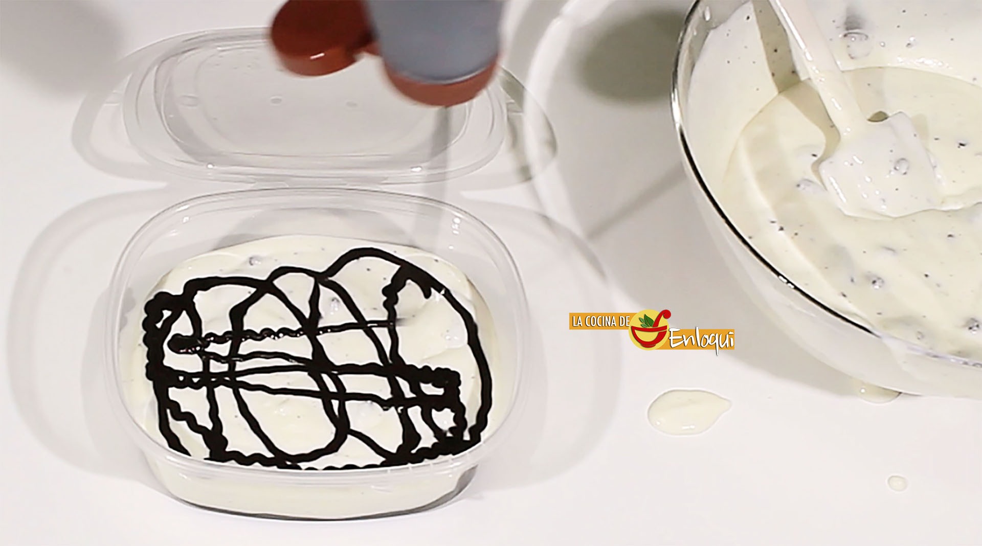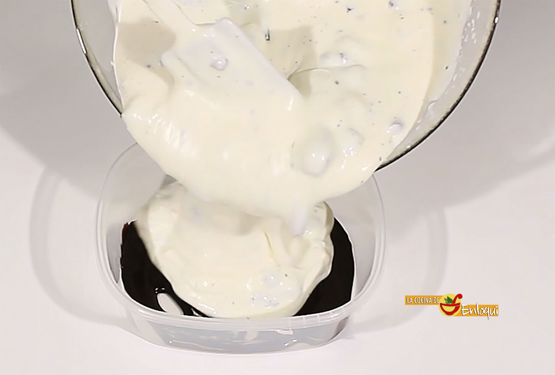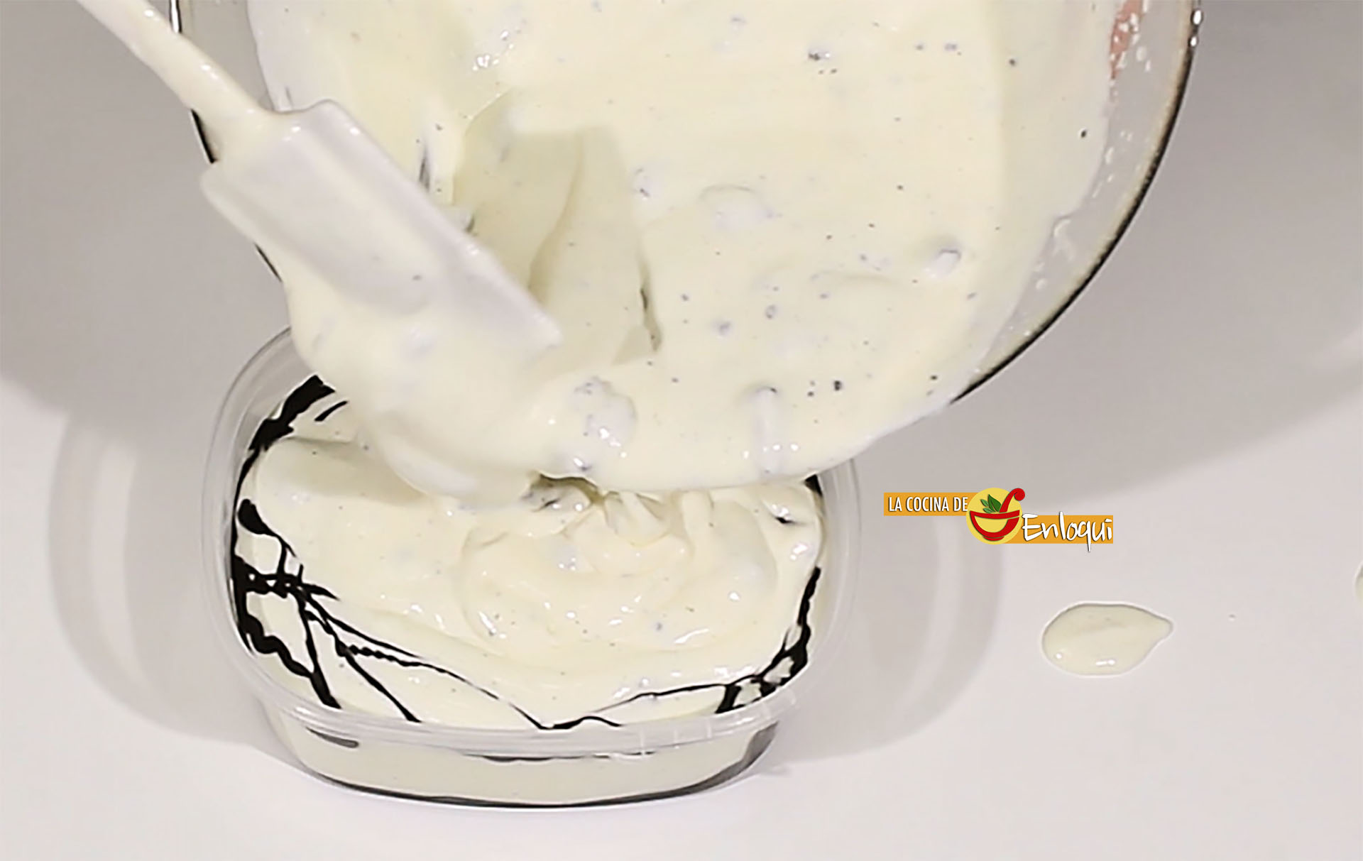 Coloca la tapadera y lleva al congelador, durante al menos, 5 horas. Te recomiendo que durante las 2-3 primeras horas vayas cada media hora y remuevas un poco. De esta forma conseguirás un resultado mucho más cremoso.