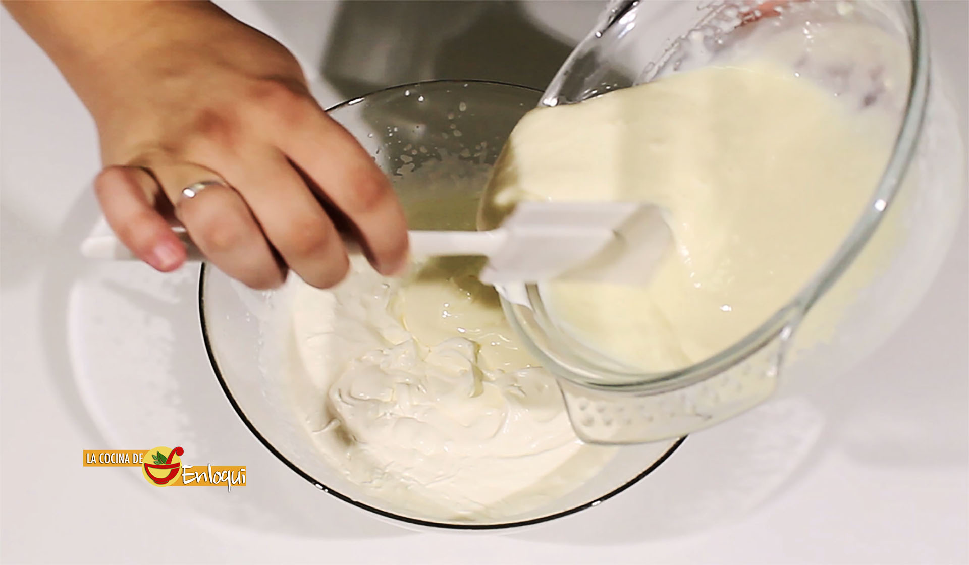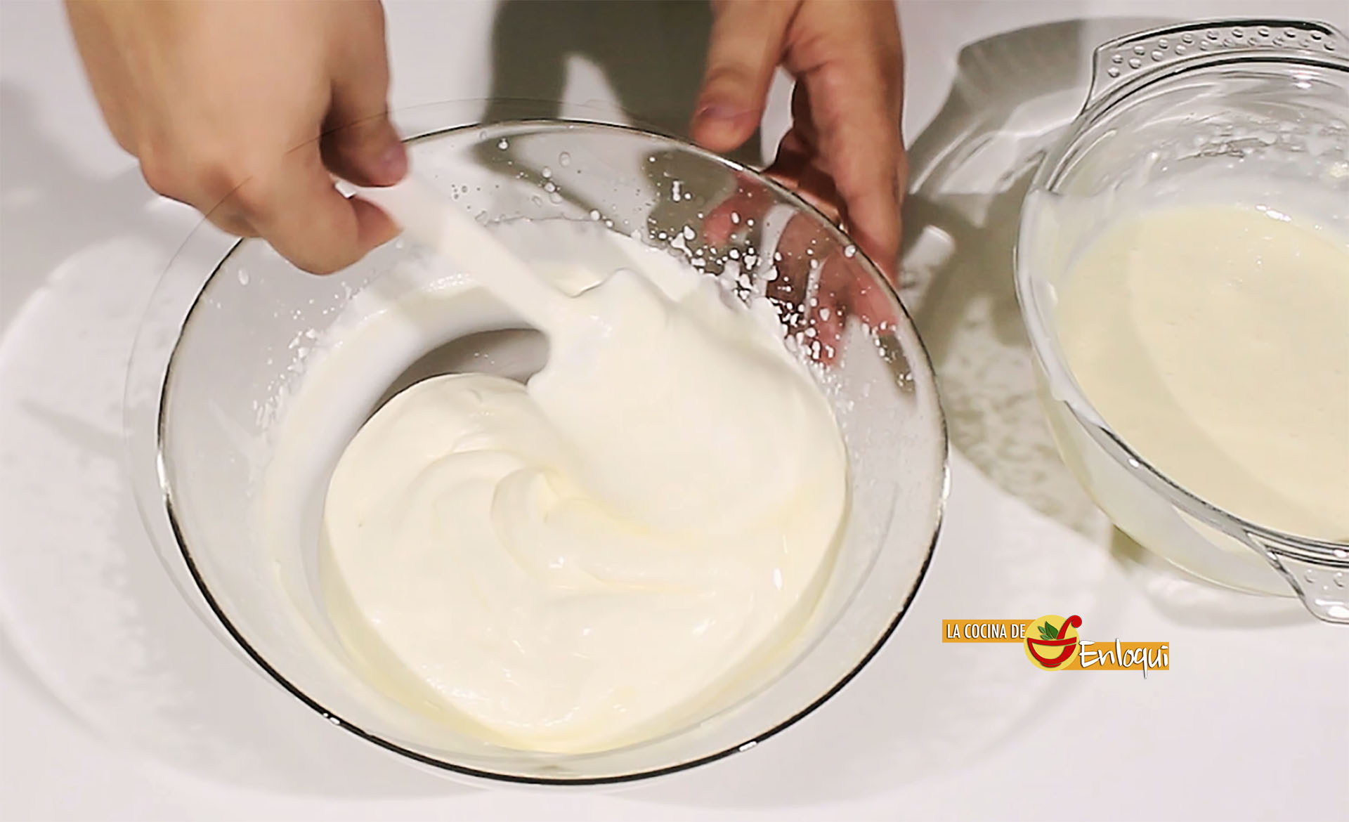 Ahora es el momento de unir las dos mezclas con ayuda de una lengua o espátula de cocina, con movimientos envolventes para que la nata no pierda volumen.