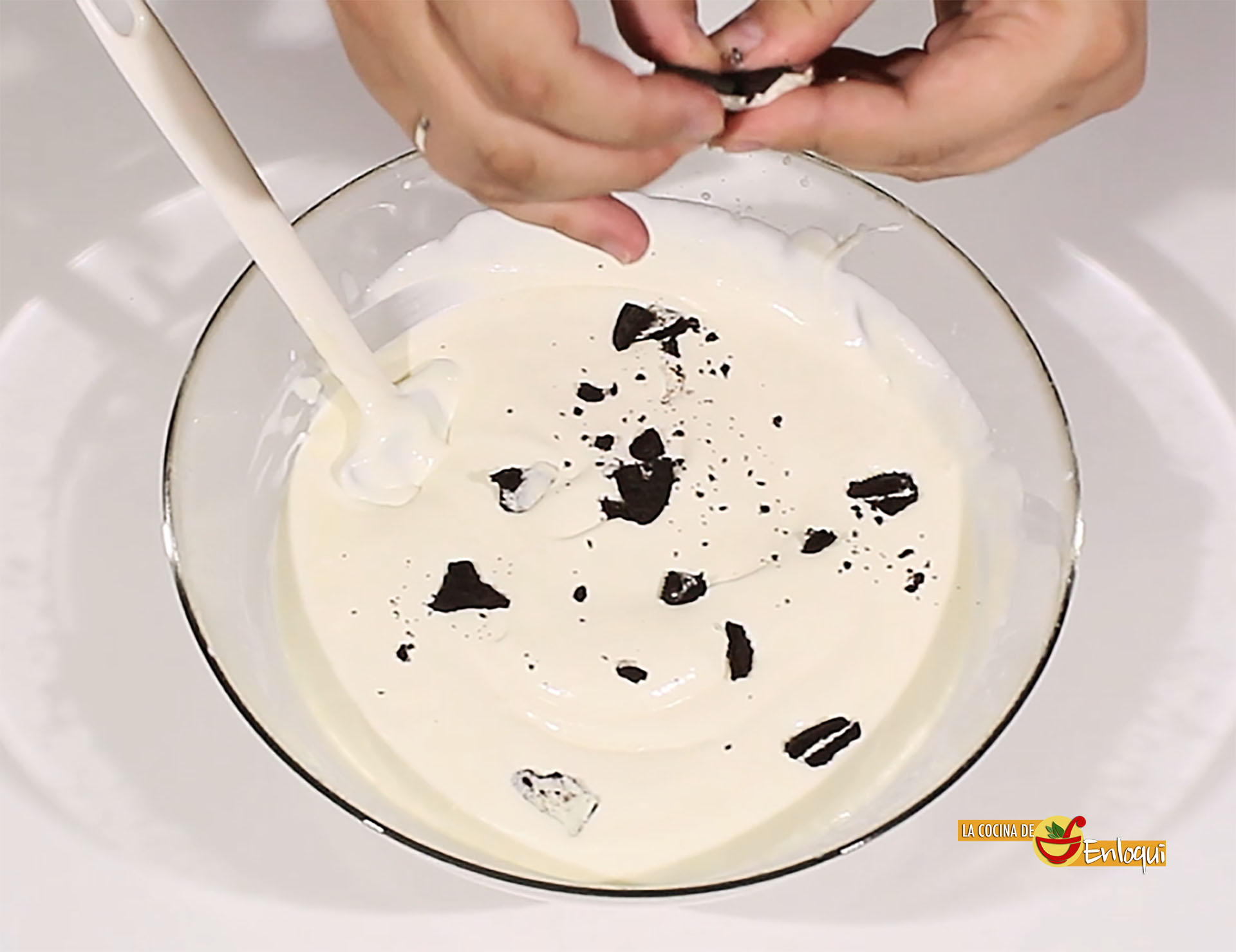 Mezcla hasta que todo quede bien integrado en una crema. En el momento en que todo quede bien mezclado añade las galletas oreo troceadas (reservamos 4 para decorar). Yo las he troceado con las manos en trozos irregulares, que luego notemos en nuestro helado los trozos de galleta. Sigue mezclando despacio, con movimientos envolventes hasta que las galletas queden bien integradas en la mezcla.
