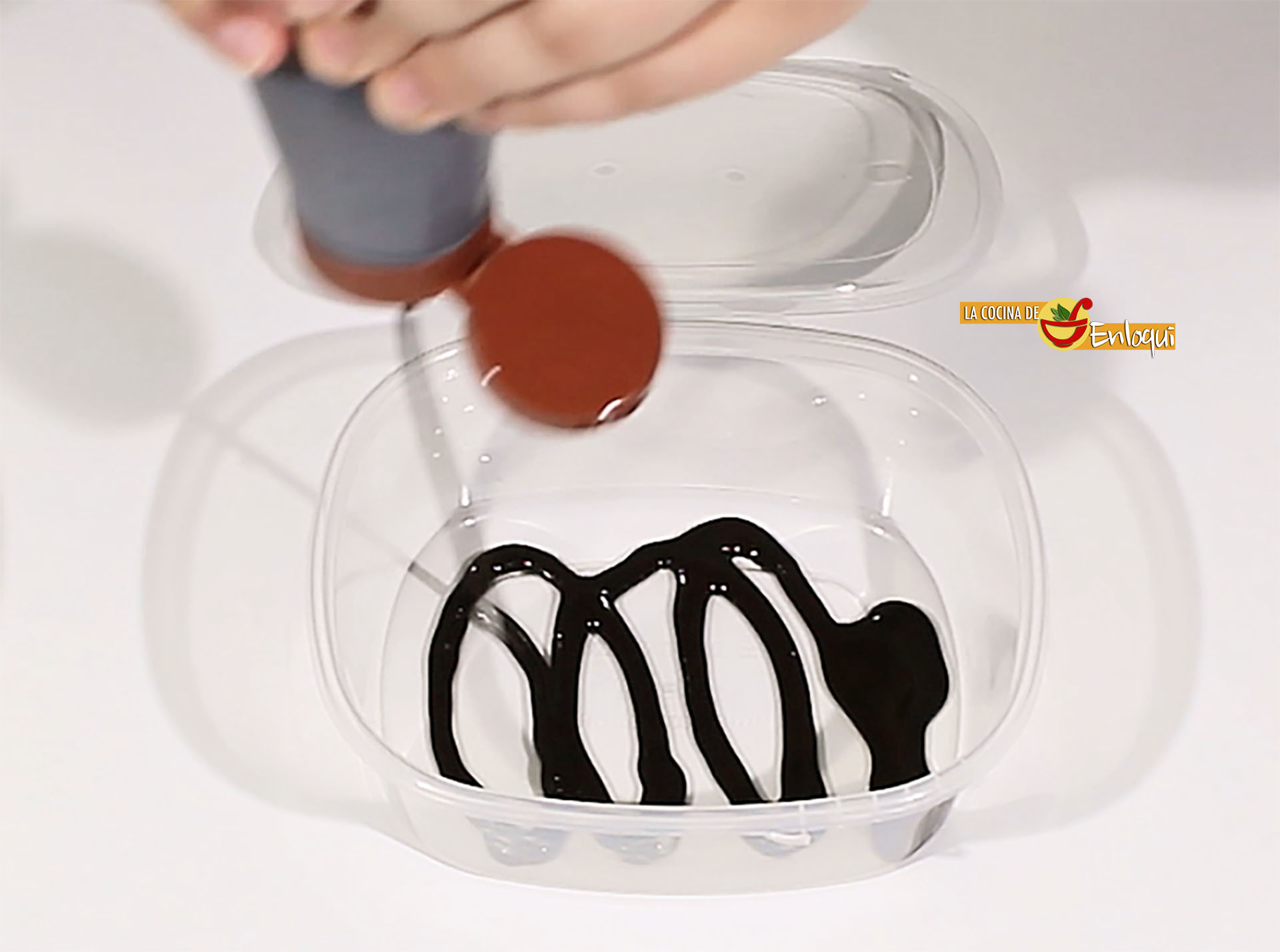En este recipiente pon en la base una capa de sirope de chocolate. Sobre él vierte la mezcla que has obtenido. vuelve a poner otra capa de sirope y por último coloca el resto de la crema.