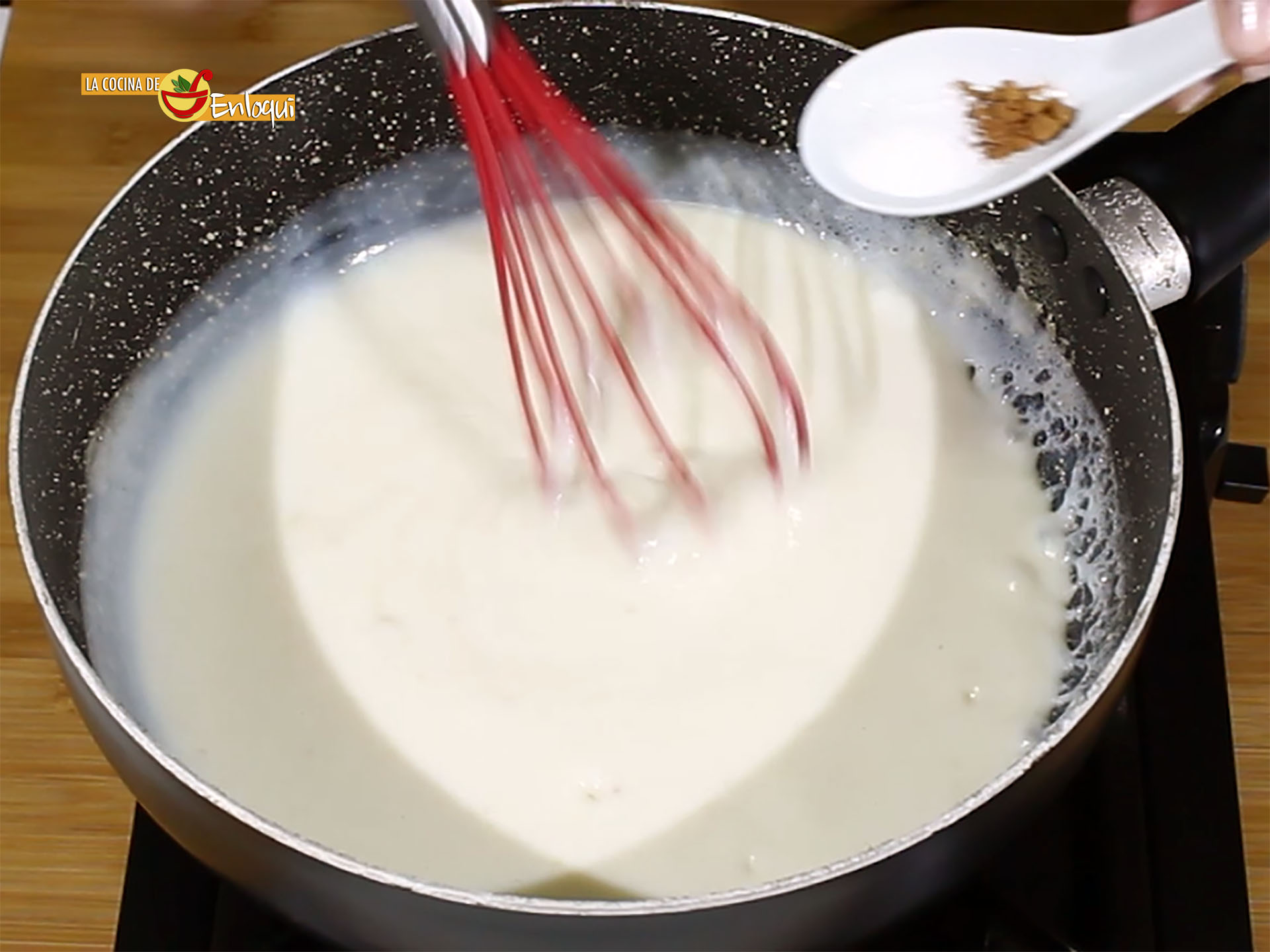 Añade un poco de sal y de nuez moscada. Remueve hasta que la bechamel tenga la textura cremosa deseada.
