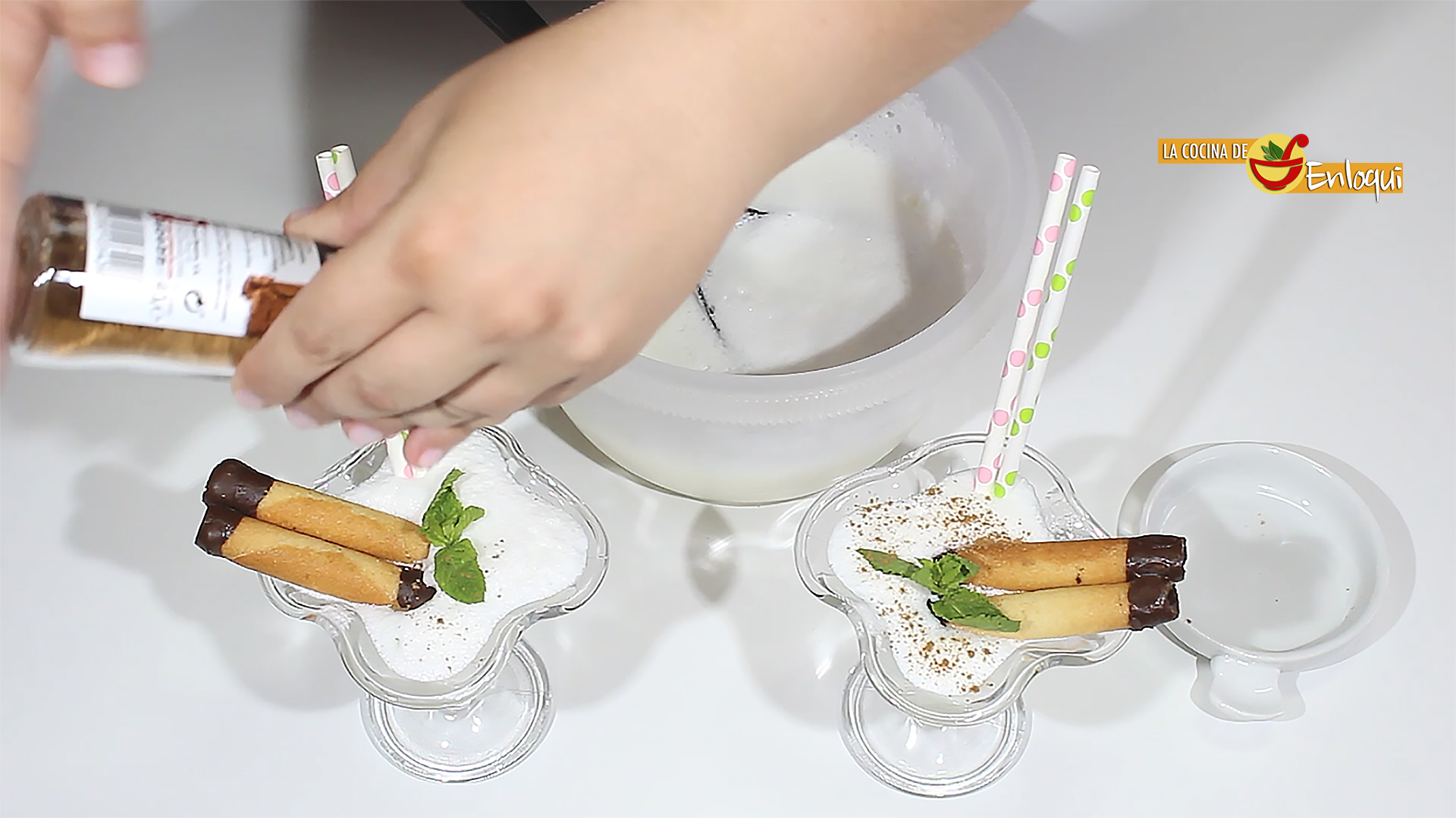 Ya sólo queda servir en copas de helado, lo puedes hacer con la ayuda de un cazo. Decora con unos barquillos, unas hojas de menta y espolvorea con canela molida. Recuerda servir bien fría, así que mantén en la nevera hasta el momento de llevar a la mesa.