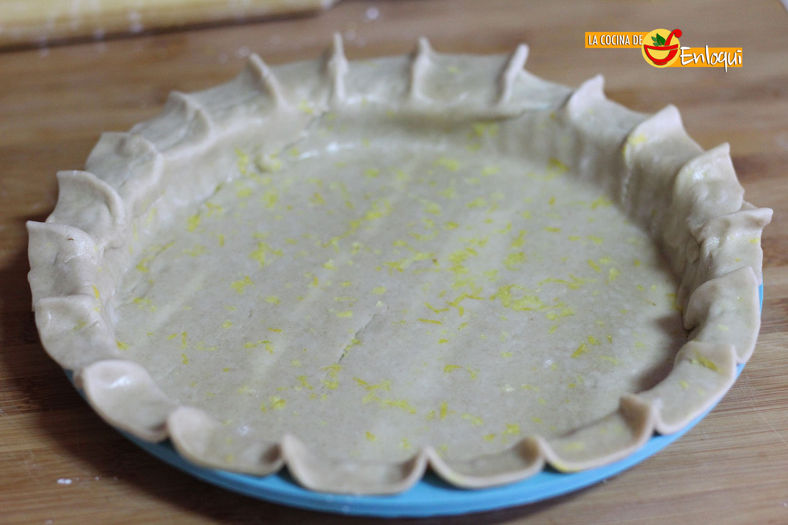 Comenzamos estirando la masa quebrada sobre la superficie de trabajo. Le vamos a dar un toque dulce y aromático esparciendo por encima las ralladuras de limón y el azúcar glass. Con la ayuda de un rodillo de cocina damos unas pasadas sobre la masa, de esta forma tanto el azúcar como el limón quedarán incrustados en la masa y tomará todo el sabor al hornear.