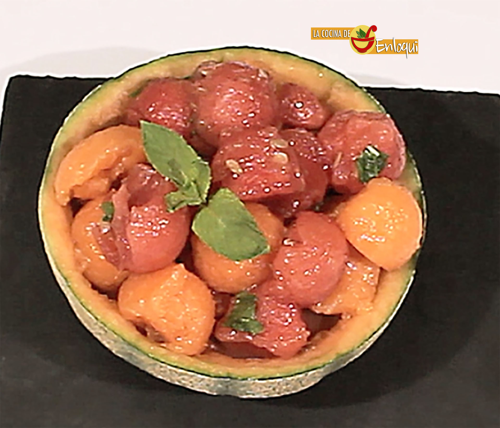 Cuando haya pasado el tiempo suficiente de macerado vierte la macedonia en la piel del melón que has preparado para servir y coloca por encima unas hojas más de hierbabuena para dar un último toque de color.