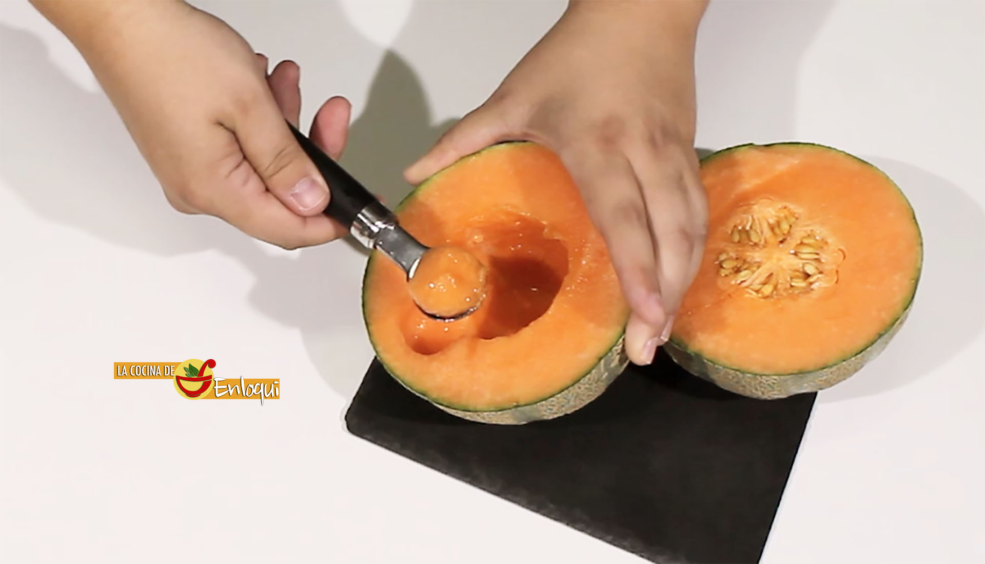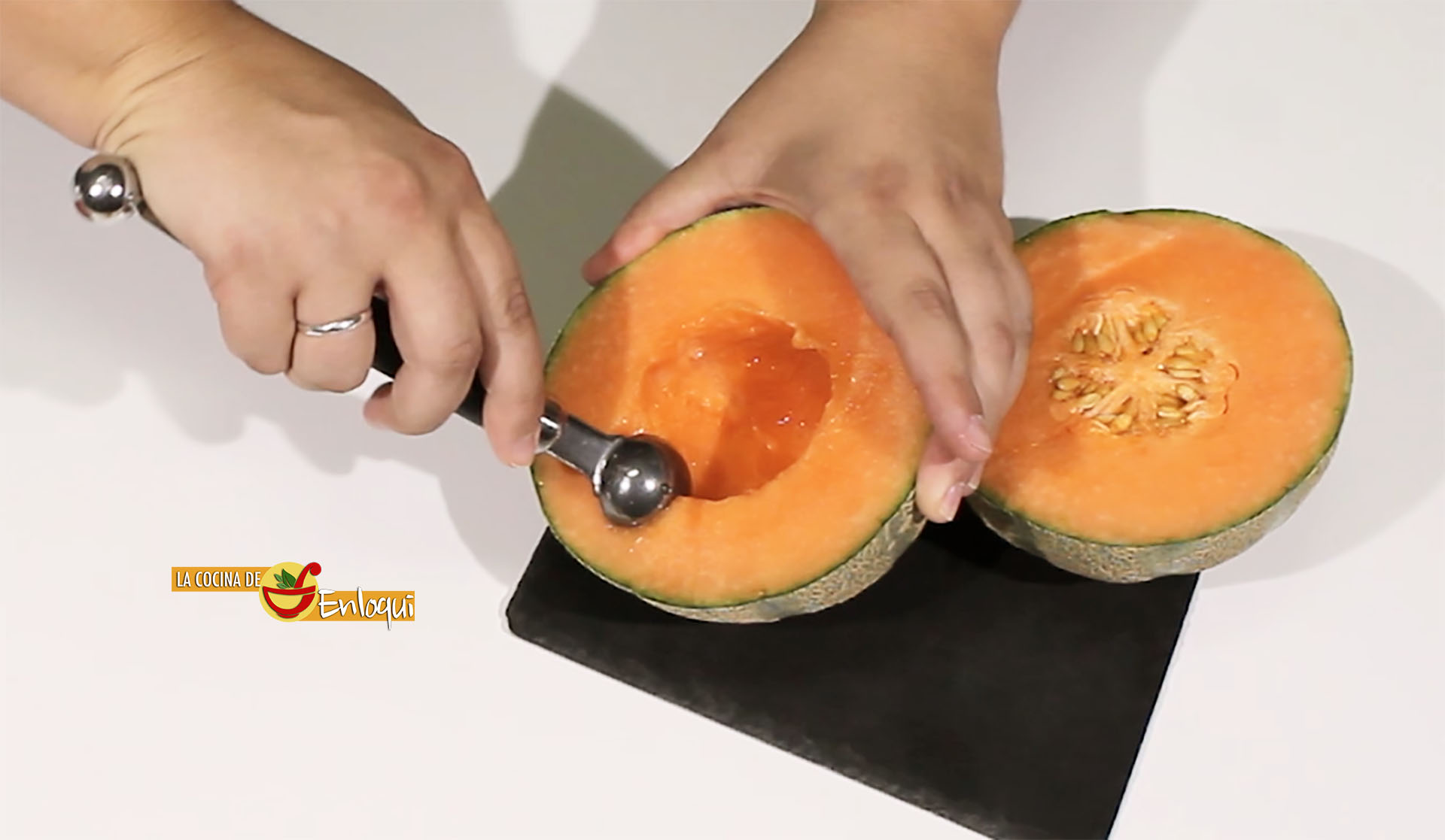 Retira en primer lugar las semillas del melón, hasta eliminarlas por completo. A continuación comienza a sacar toda la pulpa del melón con la cuchara parisina y repite el mismo proceso con la sandía.