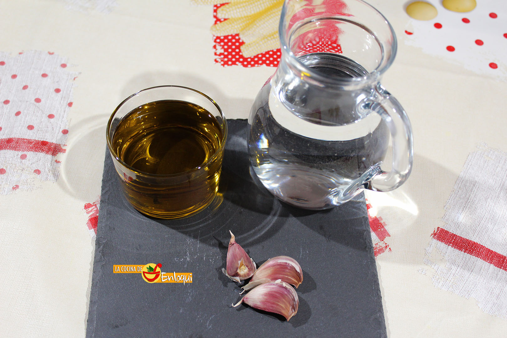 Cuando los ajos ya tienen un color doradito, sin quemarse, para que no amarguen, añadimos la sémola de trigo, la sal y el agua.
