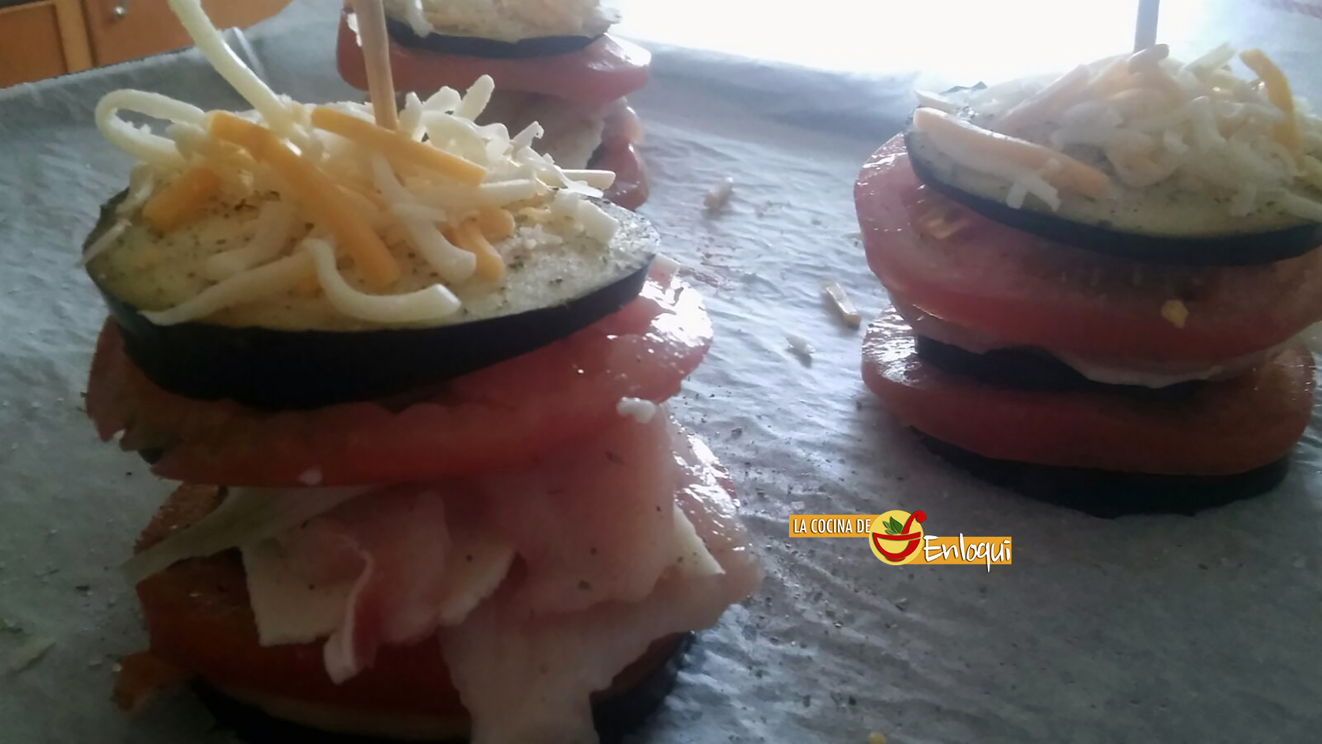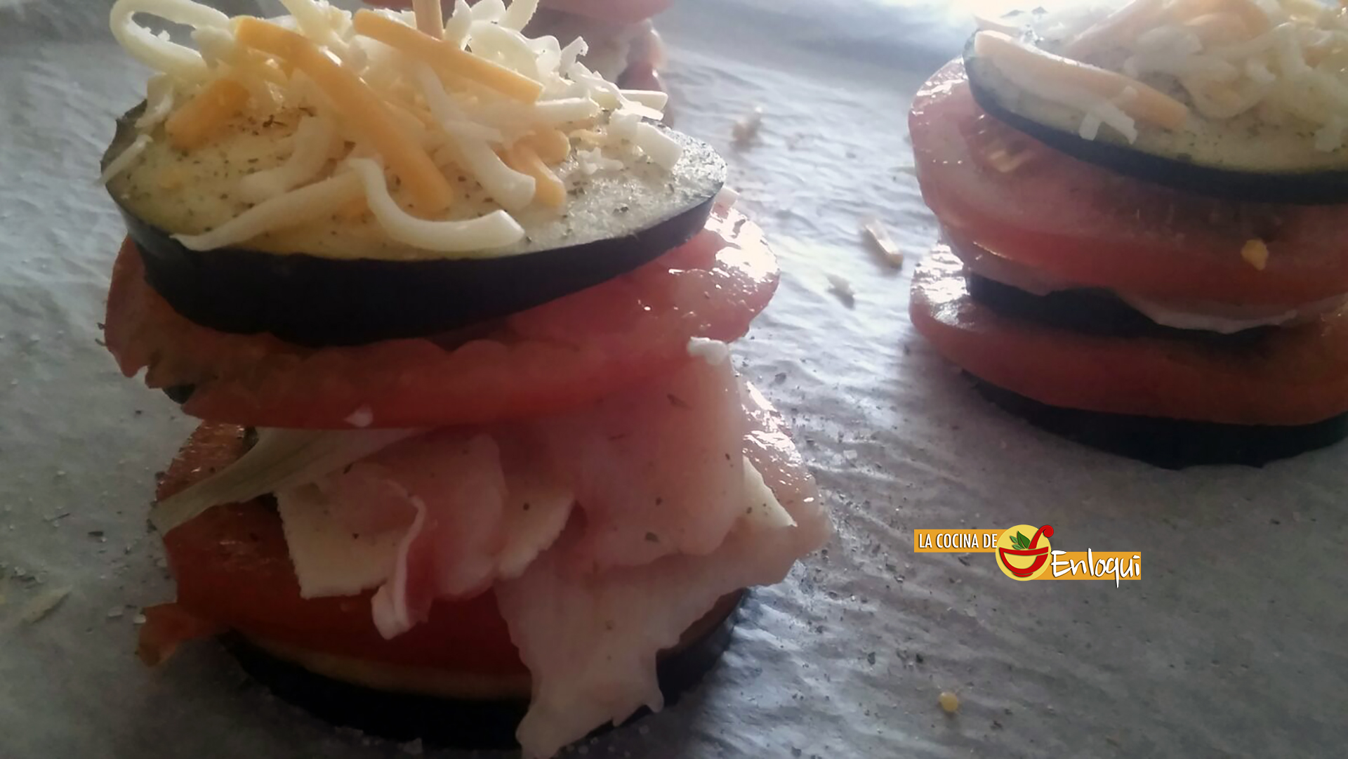 Vamos a preparar MONTADITOS DE BERENJENA. Una bonita forma de presentar verdura al horno, nos va a ayudar a acompañar otros platos creando una guarnición vistosa o bien, como entrante. Sea como sea nos queda un bocado delicioso, jugoso, sabroso y apetecible.