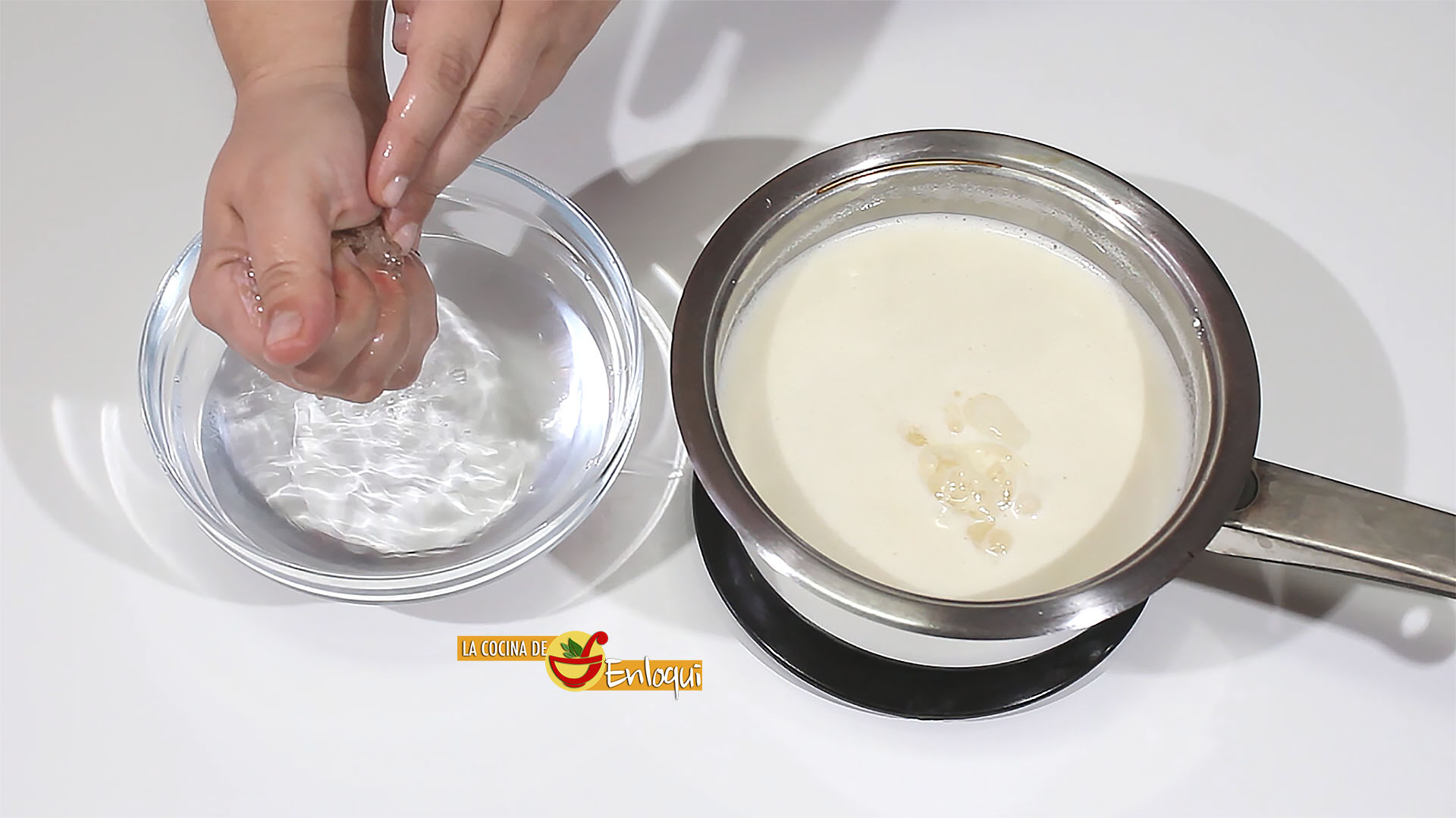 Para preparar este postre tan especial comienza poniendo a hidratar las láminas de gelatina en un poco de agua fría.