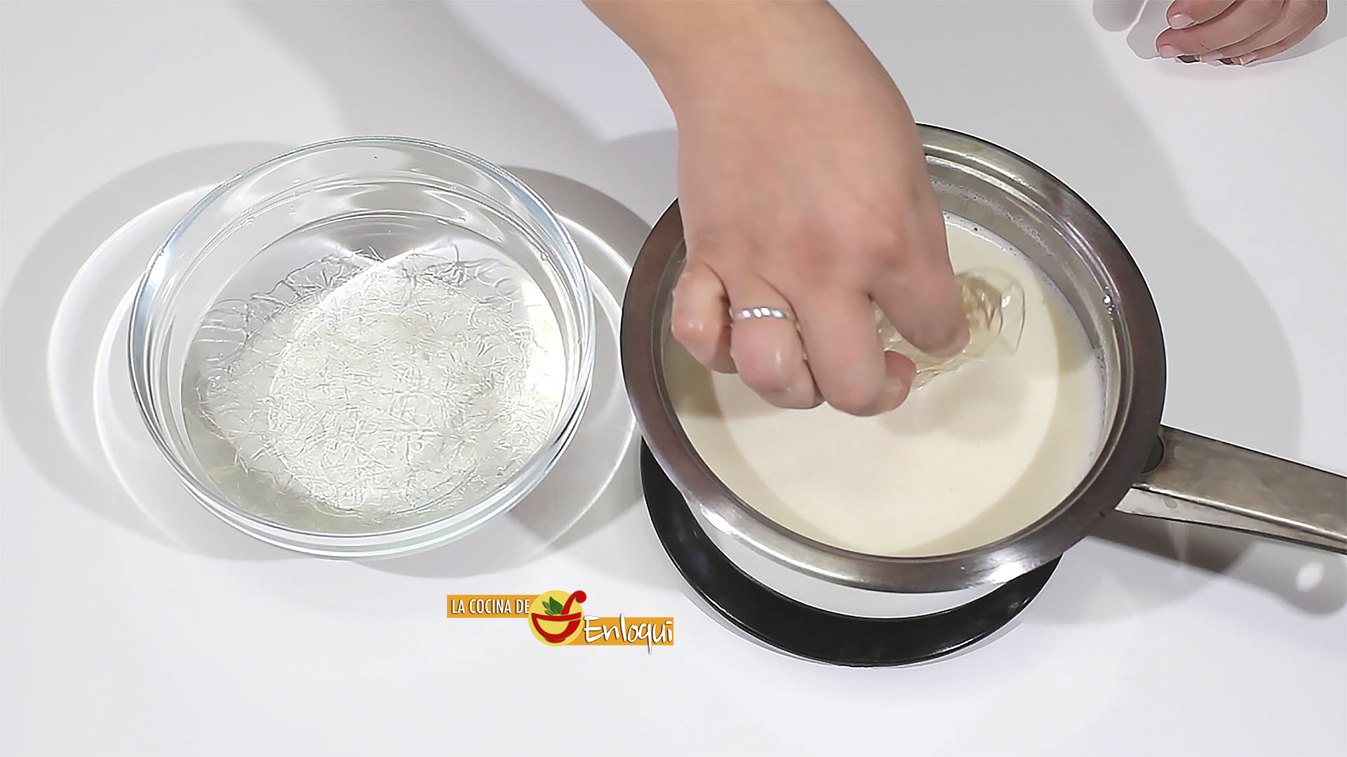 Escurre muy bien la gelatina que tenías hidratando para eliminar el máximo posible de agua y échala en el cazo que acabas de retirar del fuego. Remueve para que la galatina se disuelva por completo.