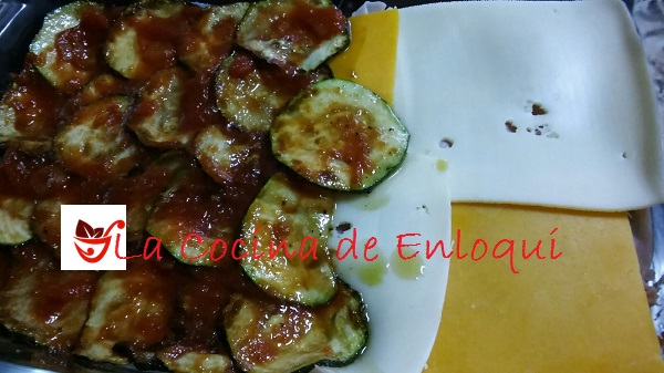 Ponemos una capa de rodajas de calabacín, la cubrimos con una capa fina de salsa de tomate casera, cubrimos con lonchas de jamón york, encima una capa de queso en lonchas y volvemos a repetir el proceso tantas veces como queramos o según la altura que nos ofrezca el recipiente. Finalizamos con una capa de calabacín que cubriremos con una capa muy finita de bechamel ligera y por último ponemos queso rallado.
