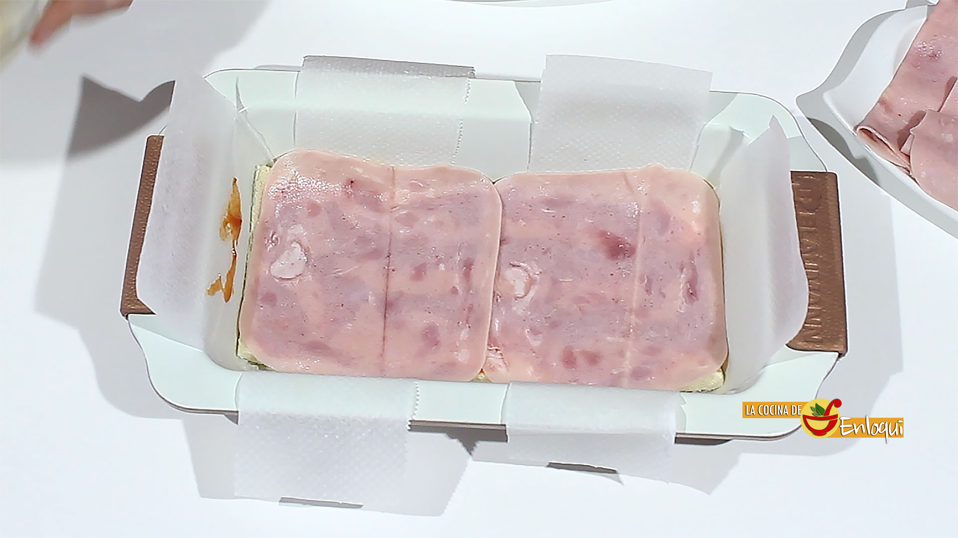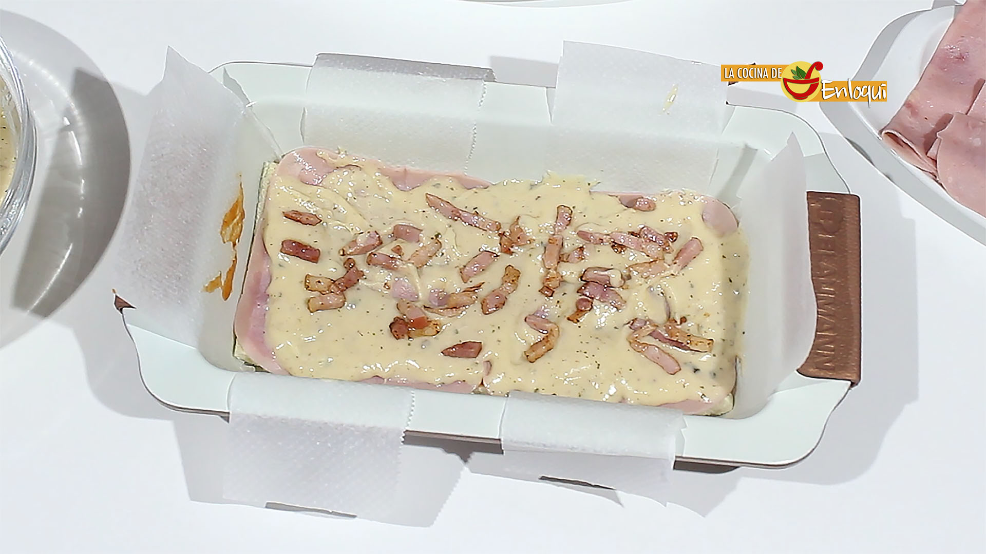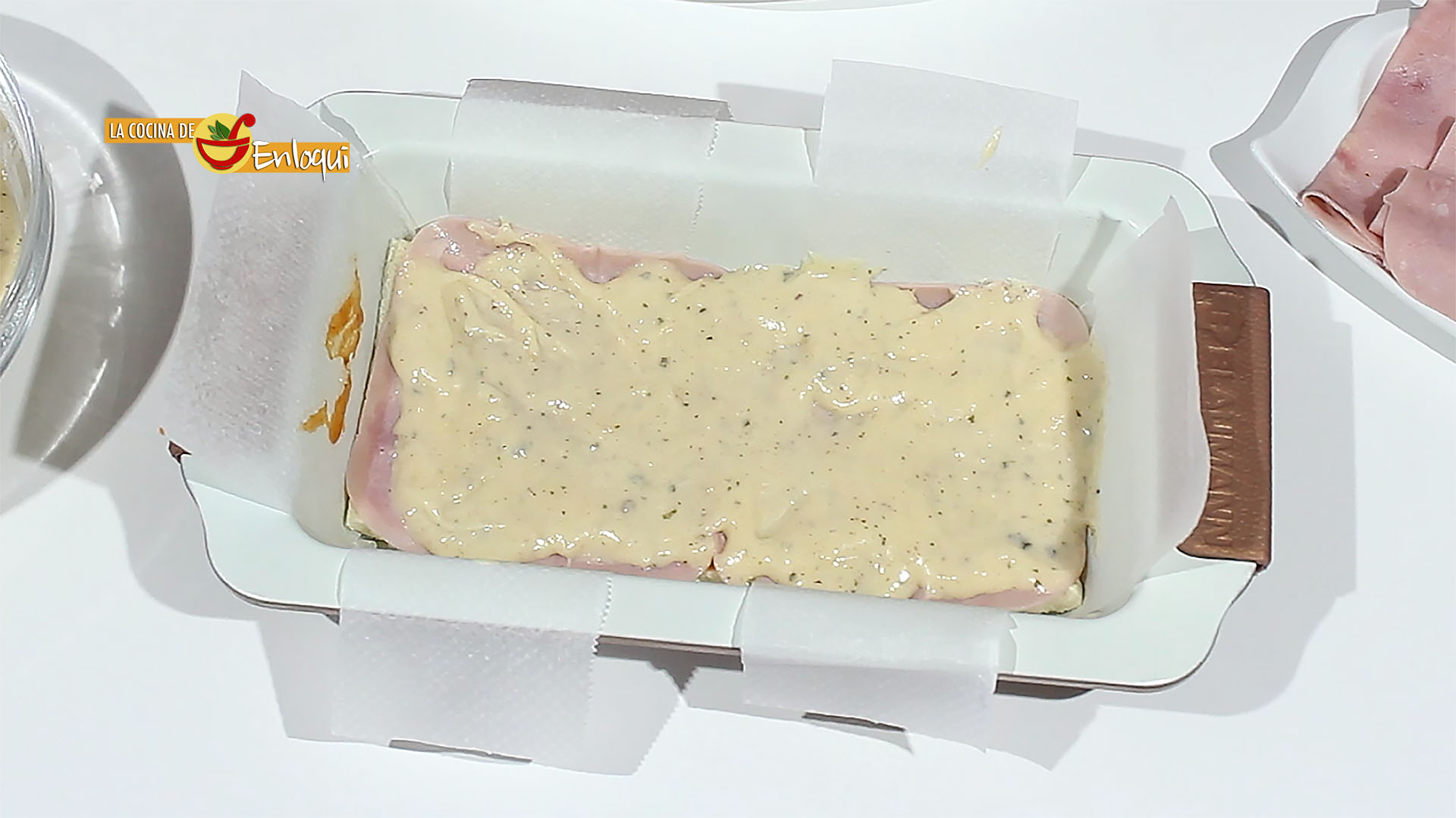 Ahora prepara un molde rectangular, fórralo con papel vegetal, de esta forma después será más fácil desmoldar. Coloca la primera capa de pan de molde.