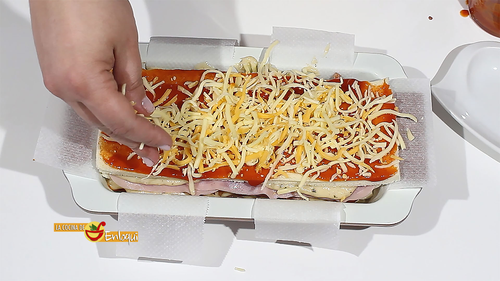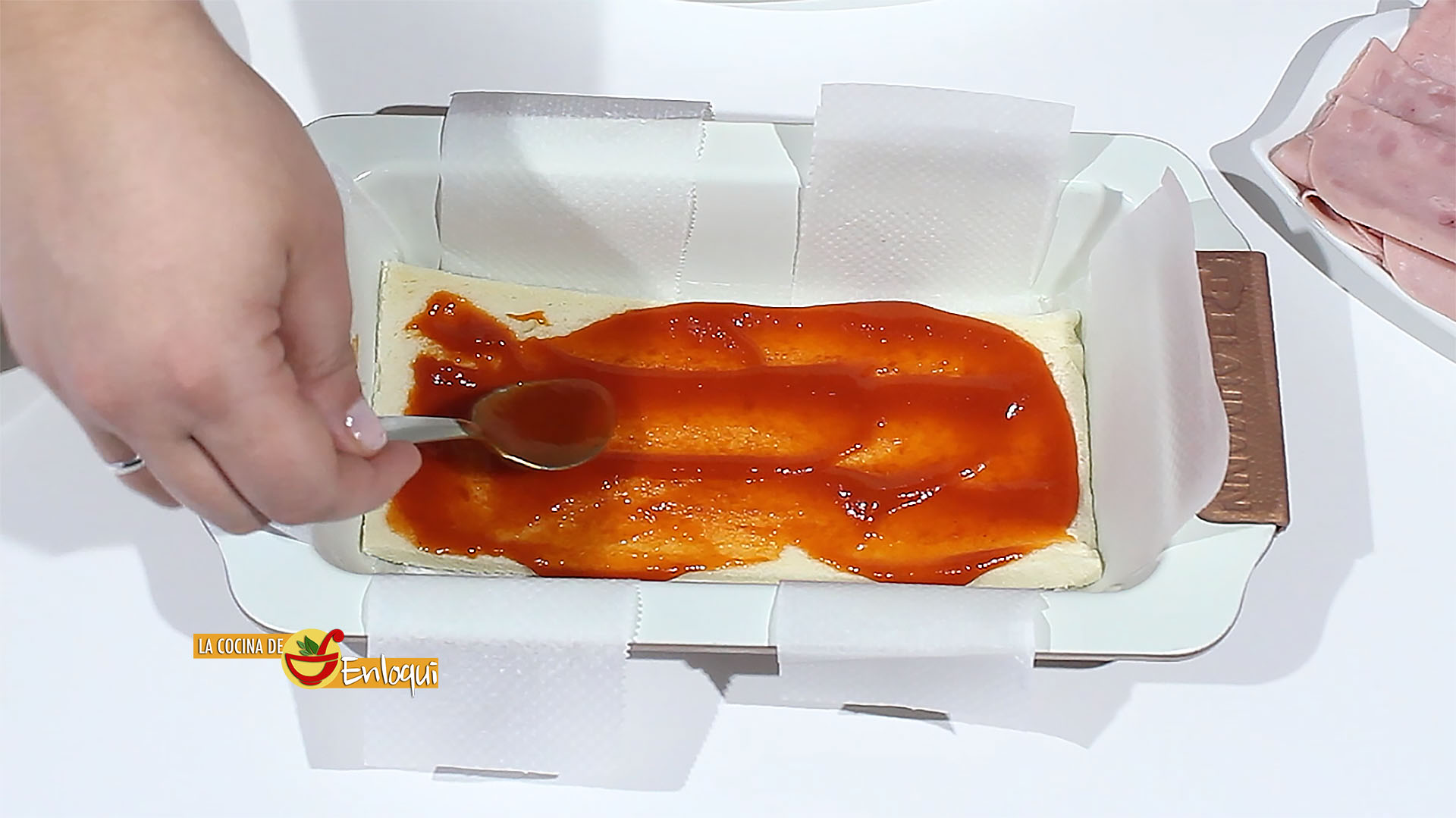 Ahora cubre con salsa de tomate y jamón cocido.