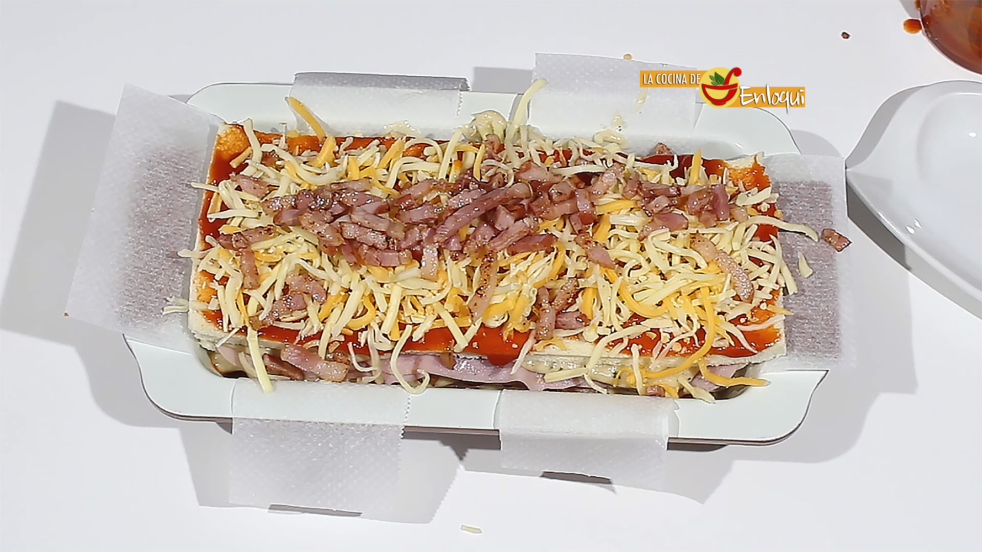 Vuelve a poner otra capa de pan y repite el proceso hasta terminar con las planchas de pan de molde y llenar el molde. Termina con una capa de pan y cubre con salsa de tomate, orégano, bacon y queso rallado.