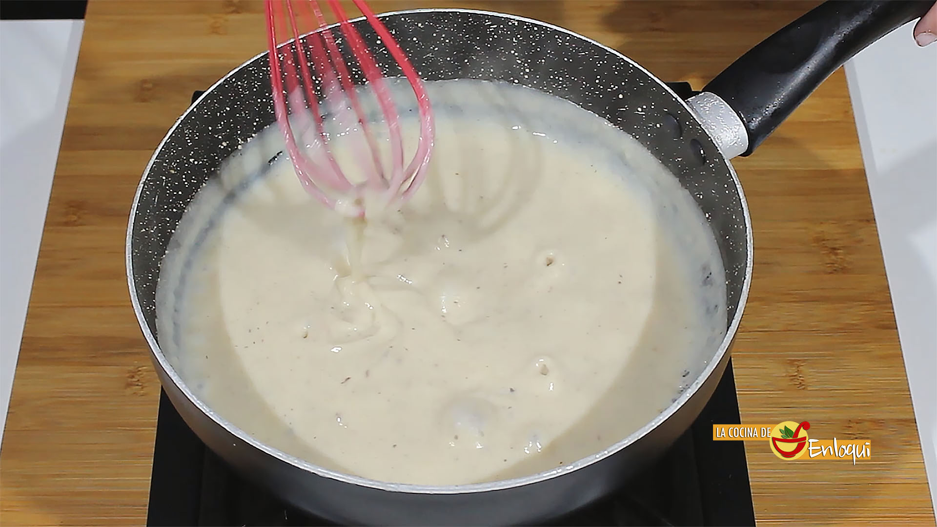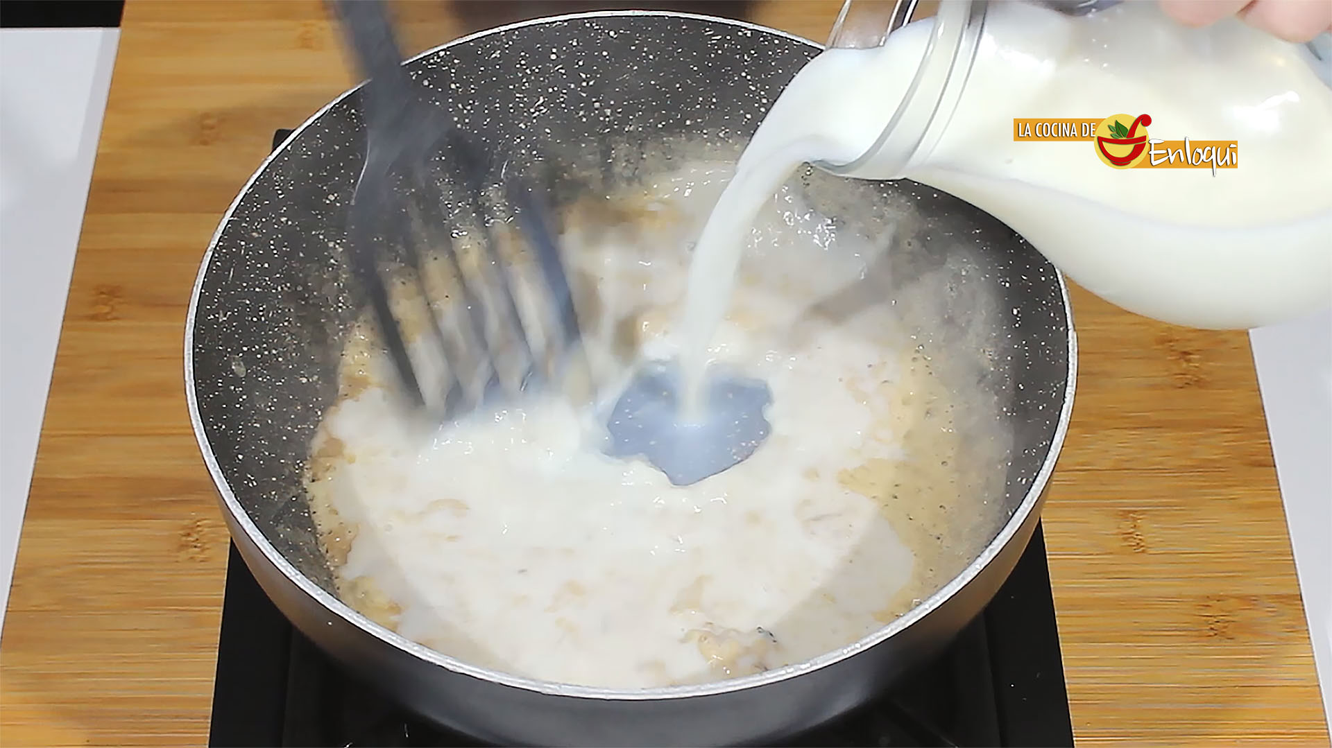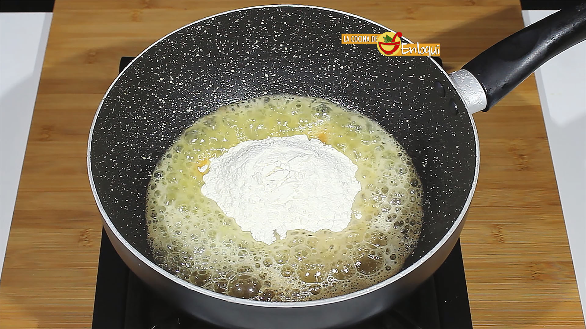 En la misma sartén, aprovechando la grasita del bacon, añade un poco de mantequilla y deja fundir. Prepara una bechamel ligera. Para ello añade un chorrito de aceite y pon la harina a tostar, cuando la harina haya tornado su color y esté tostada añade la leche.