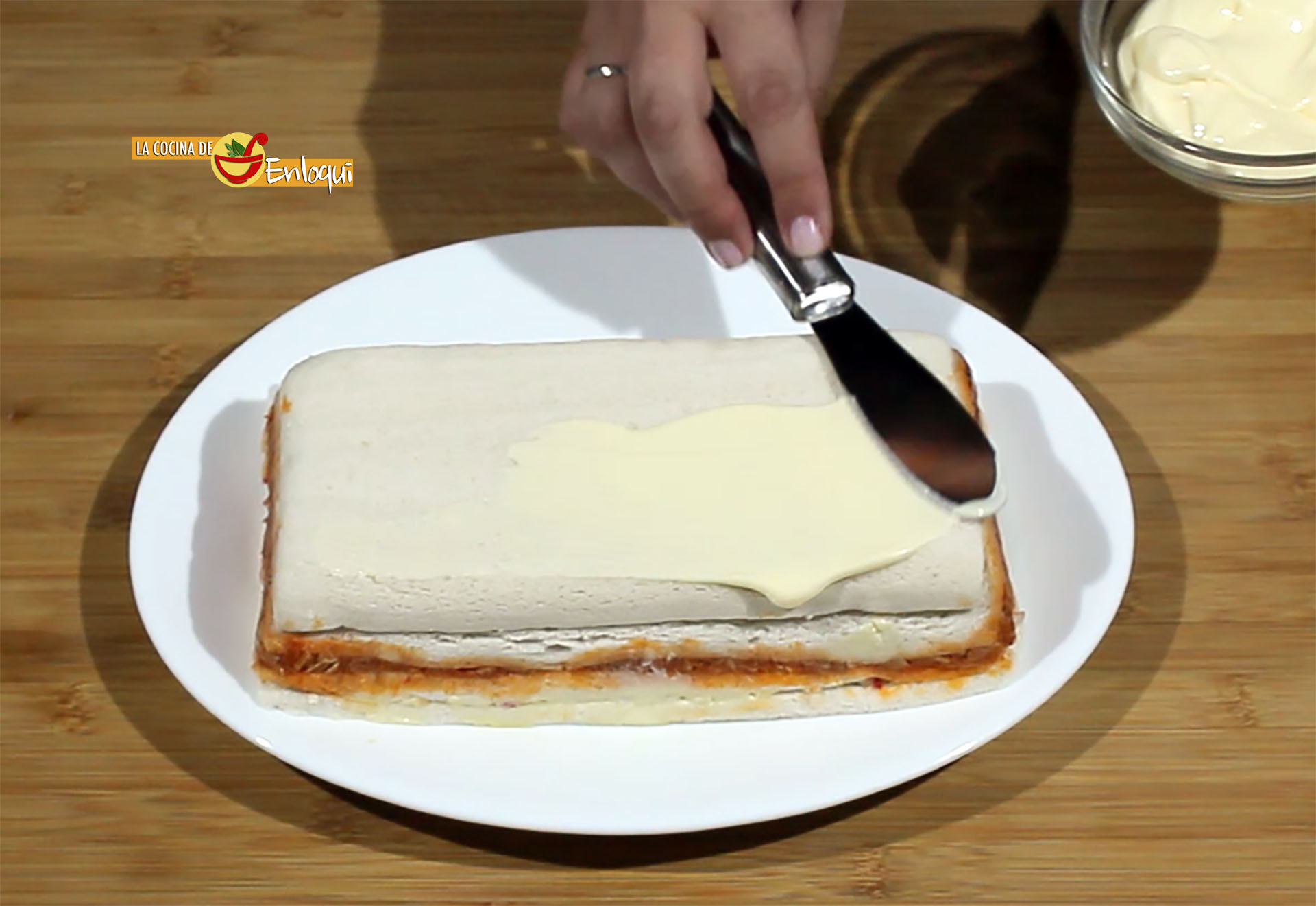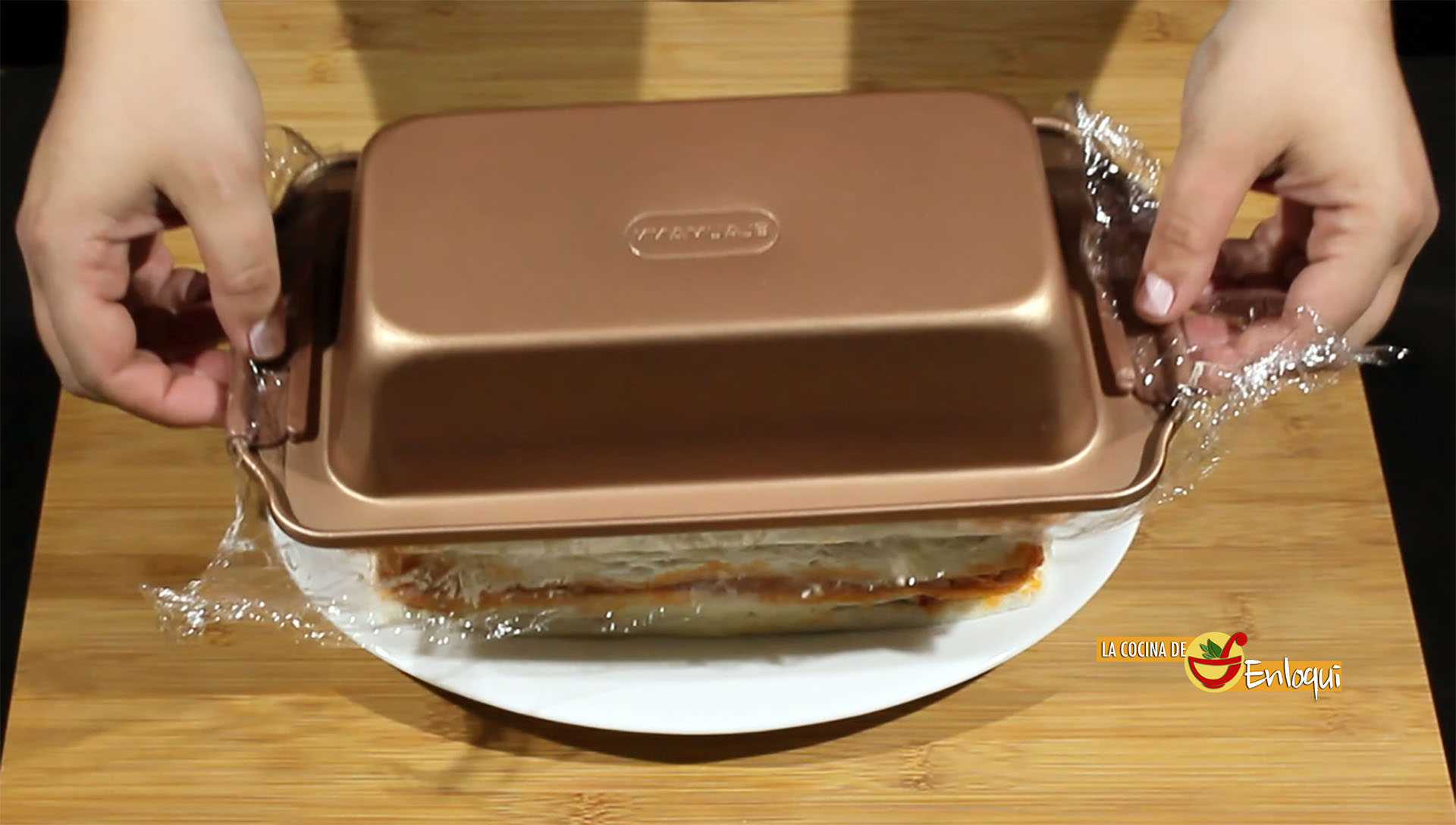 Termina siempre con una capa de pan. Una vez que tengas en el molde el total de capas de pastel y la última lámina de pan, presiona hacia abajo para que quede bien compacto. Cubre con papel film y lleva a la nevera durante, al menos, 3 horas. Lo ideal es preparar el día anterior y dejar reposar toda la noche.