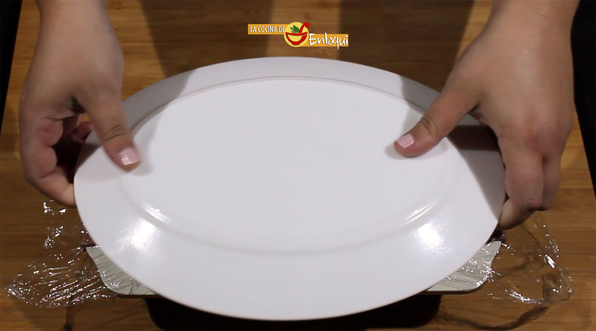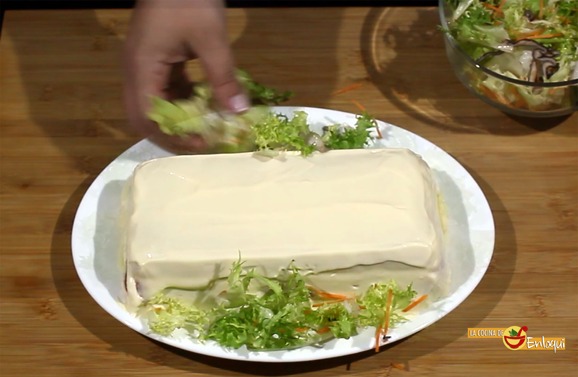 Pasado el tiempo de reposo desmolda y prepara la decoración para presentar en la mesa. Para ello coloca sobre el molde la bandeja en la que vas a presentar este entrante. Voltea y retira el molde junto con el film que habías puesto para desmoldar.