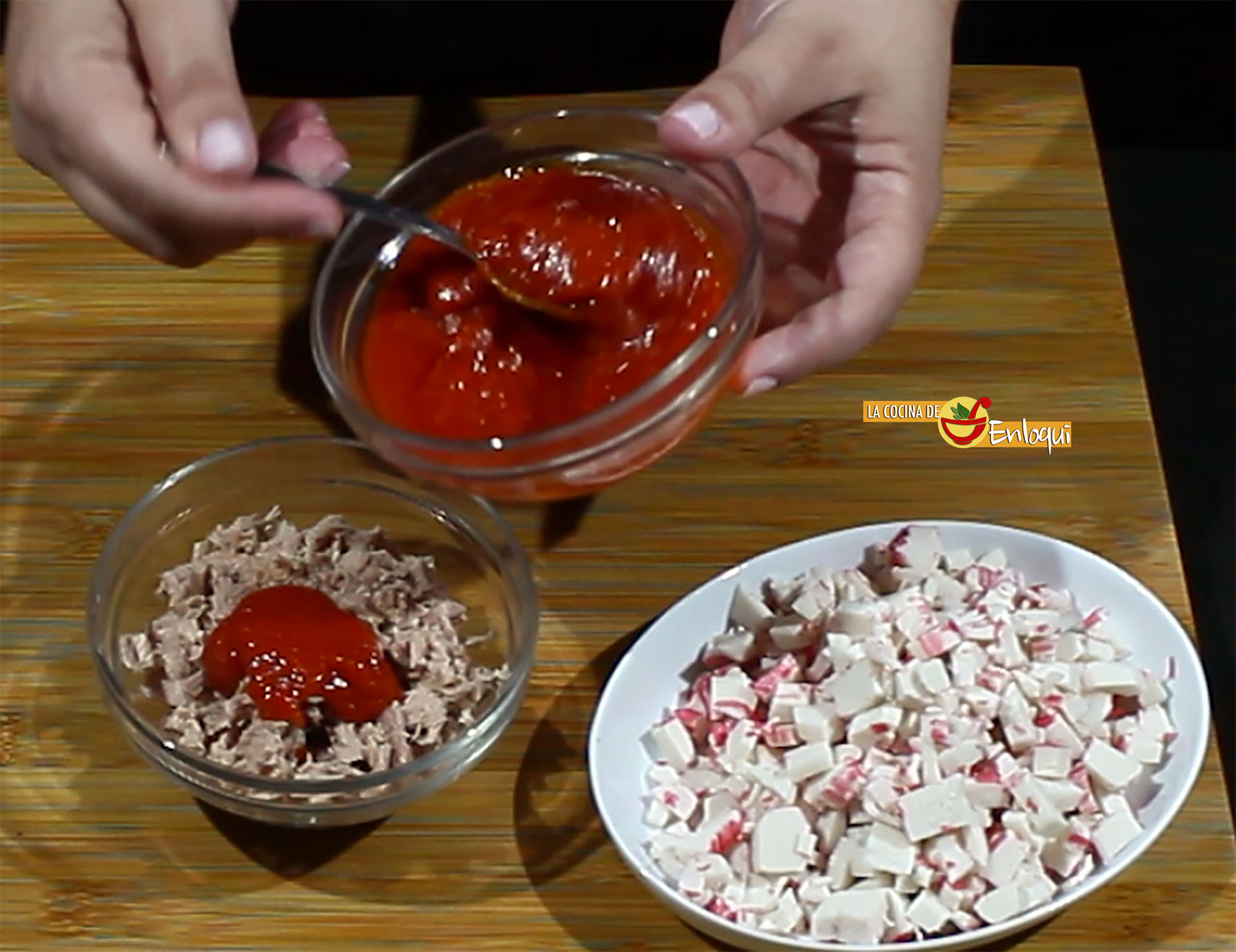 Comienza preparando los ingredientes que conformarán el relleno del pastel. Para ello corta en trocitos pequeños los palitos de surimi y reserva. También debes, en otro bol, desmigar el atún, mezclar con unas cucharadas de salsa de tomate y reserva.